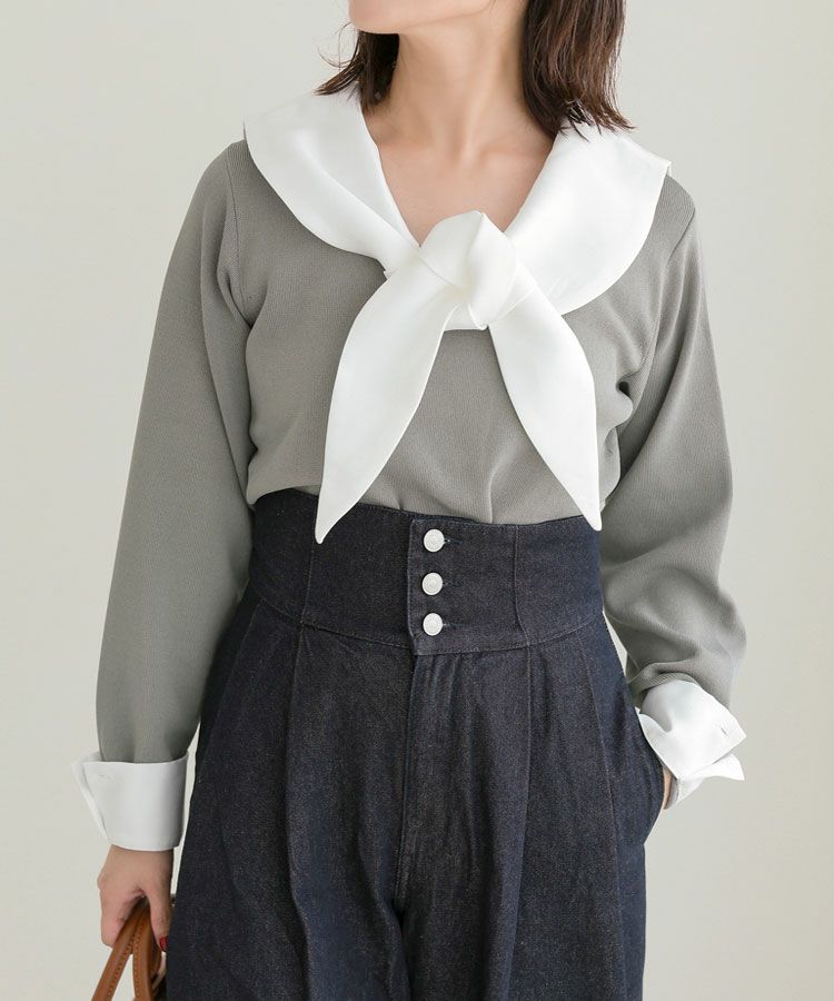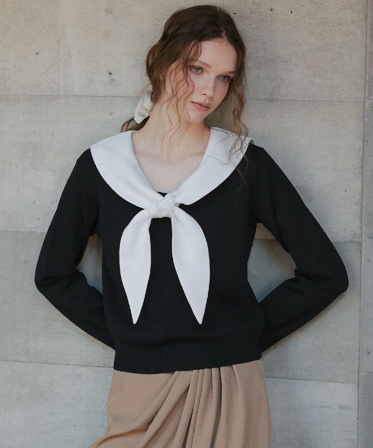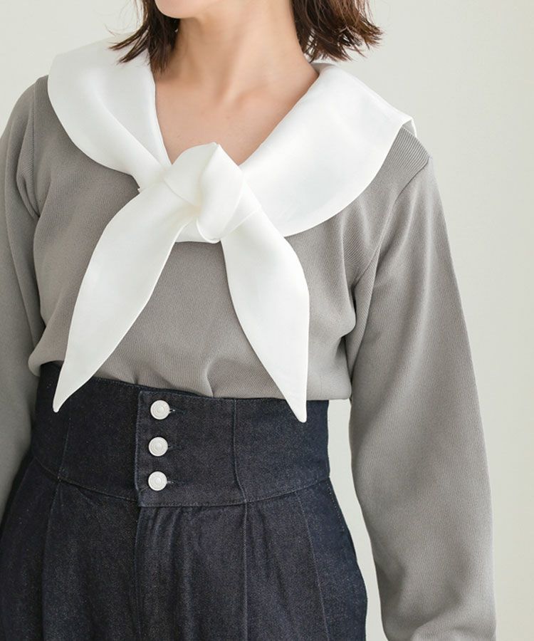 セーラーカラーがお顔周りを華やかにし、結び方アレンジで自分らしい着こなしも。