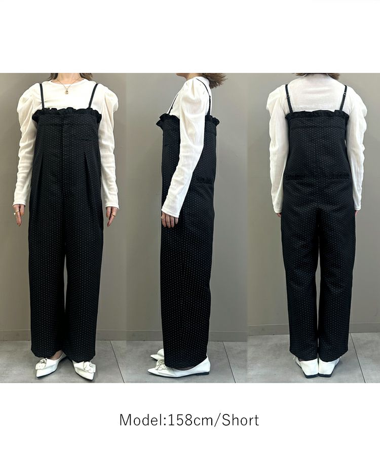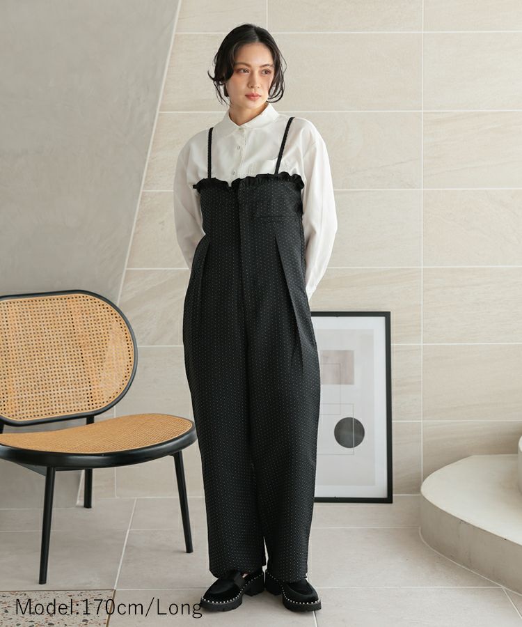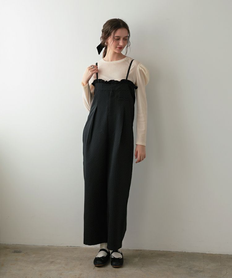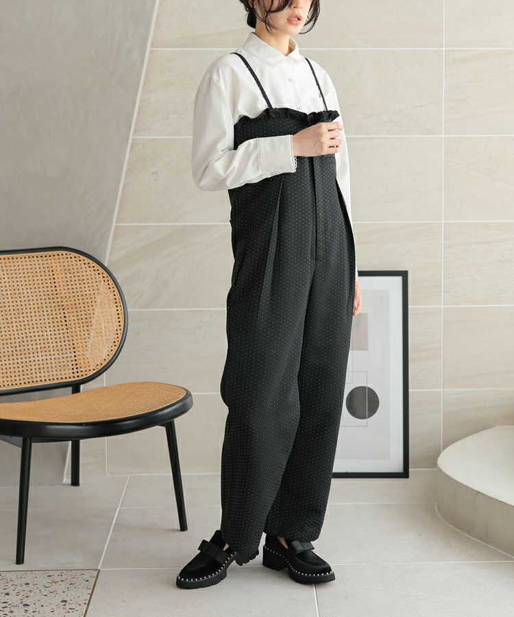 小さなドット柄が上品に映える、フェミニンムードたっぷりのサロペット。