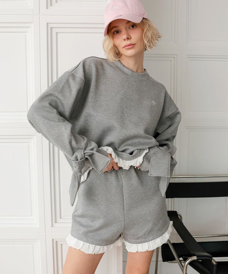 ふんわりホイップのようなフリルをあしらったトップスとショートパンツのセットアップ。