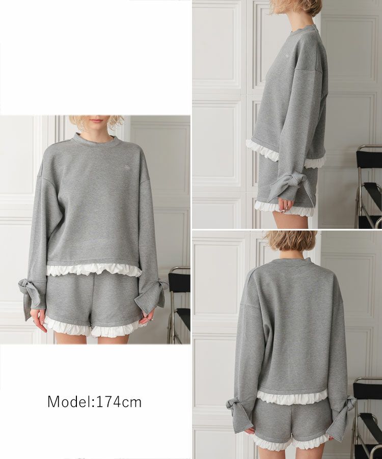 スウェット見えのするポンチ素材でリラックス感のある着心地ながら、フリルのアクセントと袖口のリボンが「大人可愛い」が叶います。