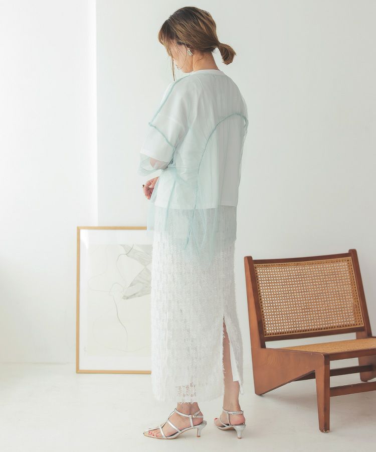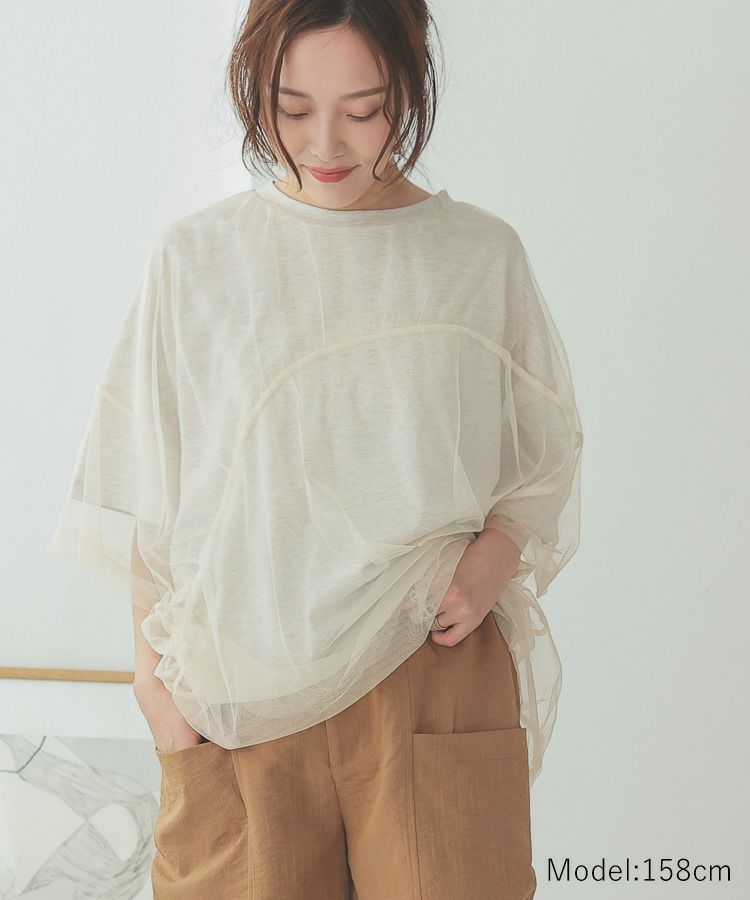 カジュアルなTシャツにギャザーを施したチュールシアー素材をプラスしたトップス。