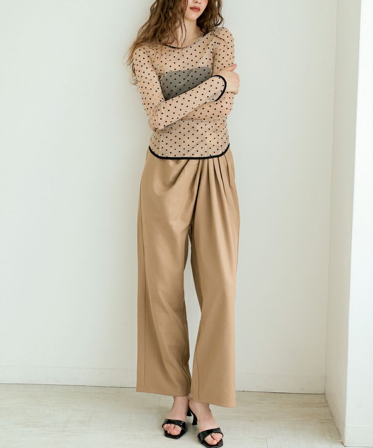 女性らしいフリルデザインを、落ち感のあるパンツとパンプスでスマートにまとめた上品スタイル。