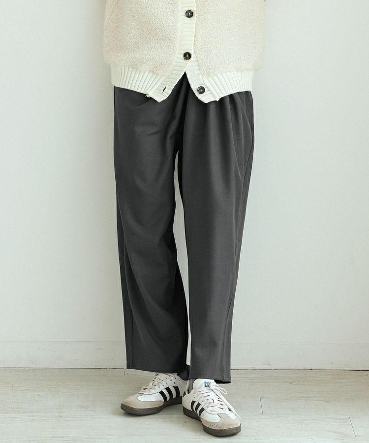 ゆるっとしたスウェットベストにドレープパンツを合わせて、抜け感のある大人カジュアルスタイルに。スウェットベストのラフさとドレープパンツの上品さが絶妙にマッチ。
