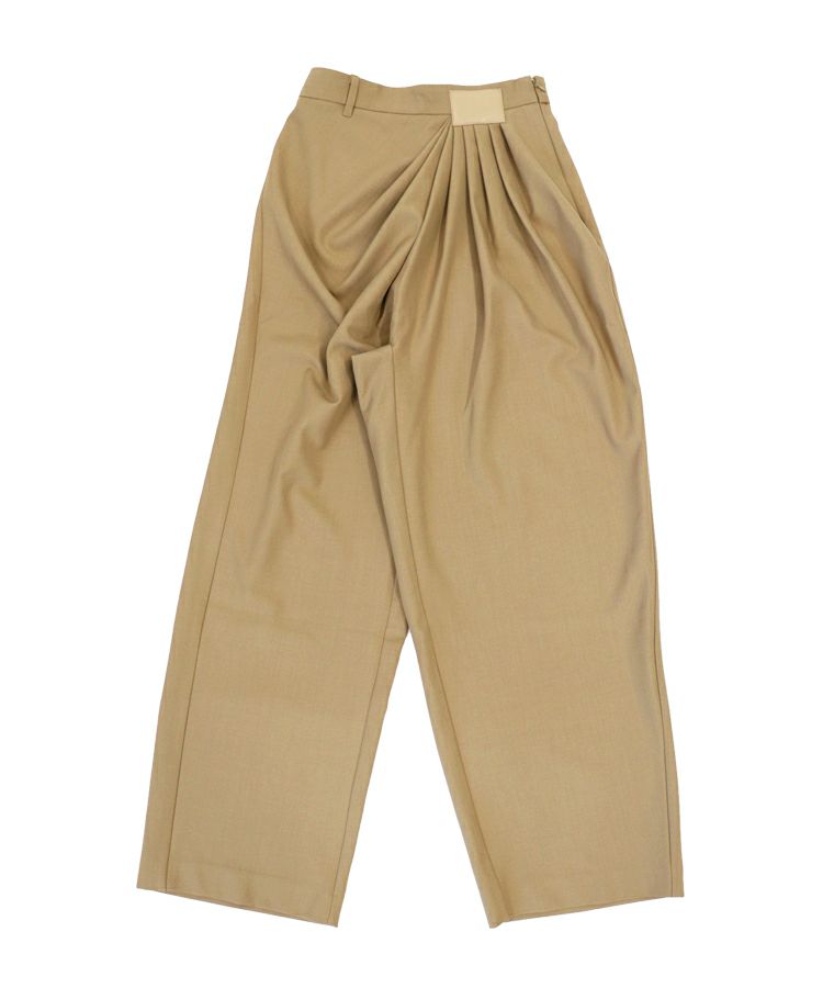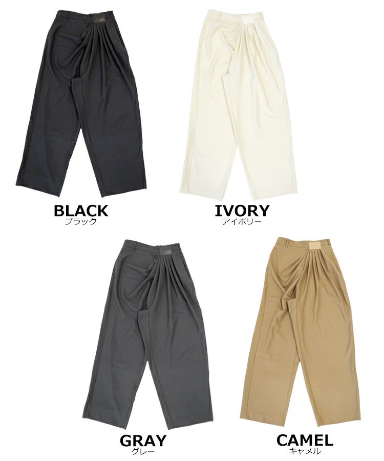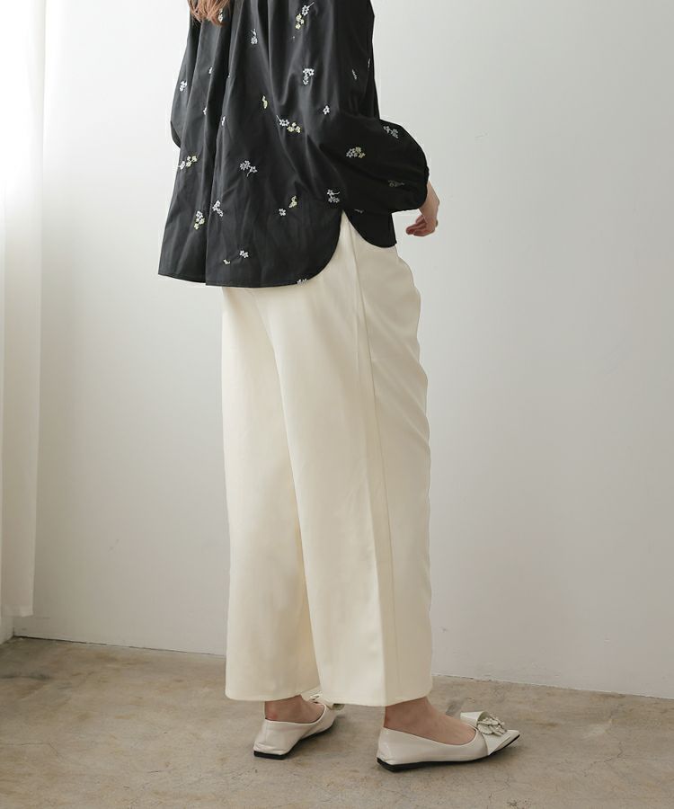 女性らしいフリルデザインを、落ち感のあるパンツとパンプスでスマートにまとめた上品スタイル。
