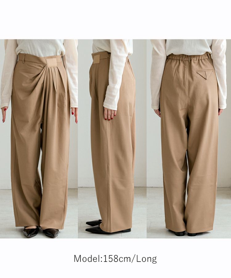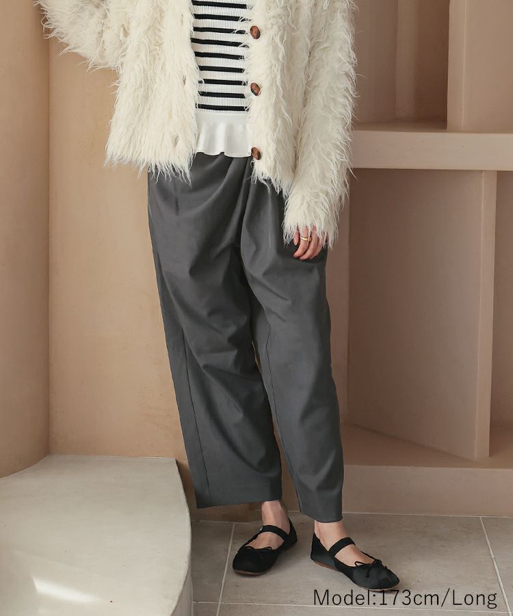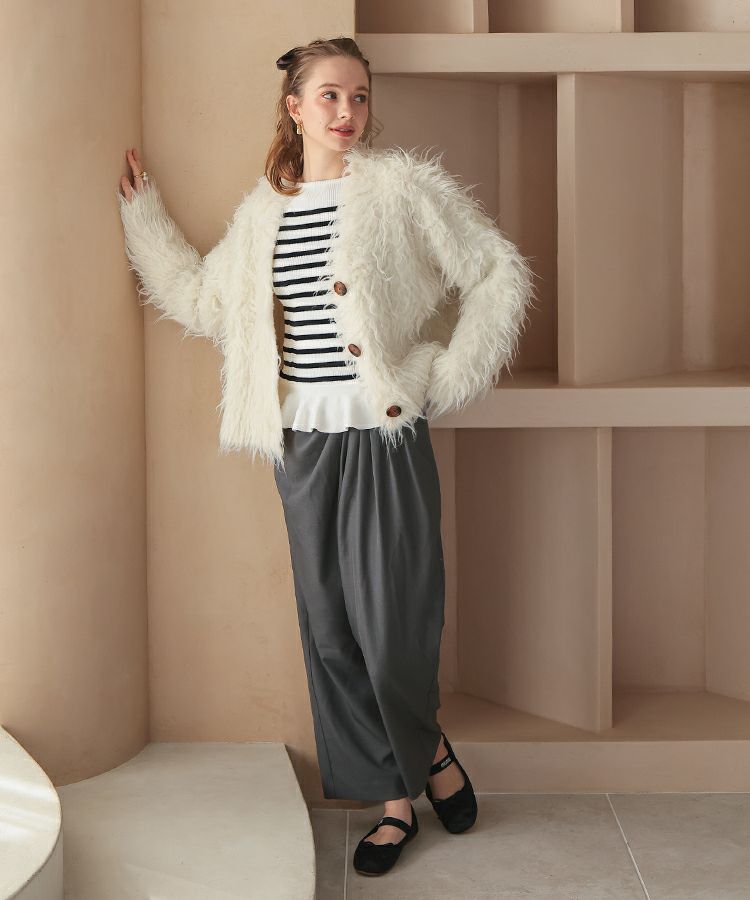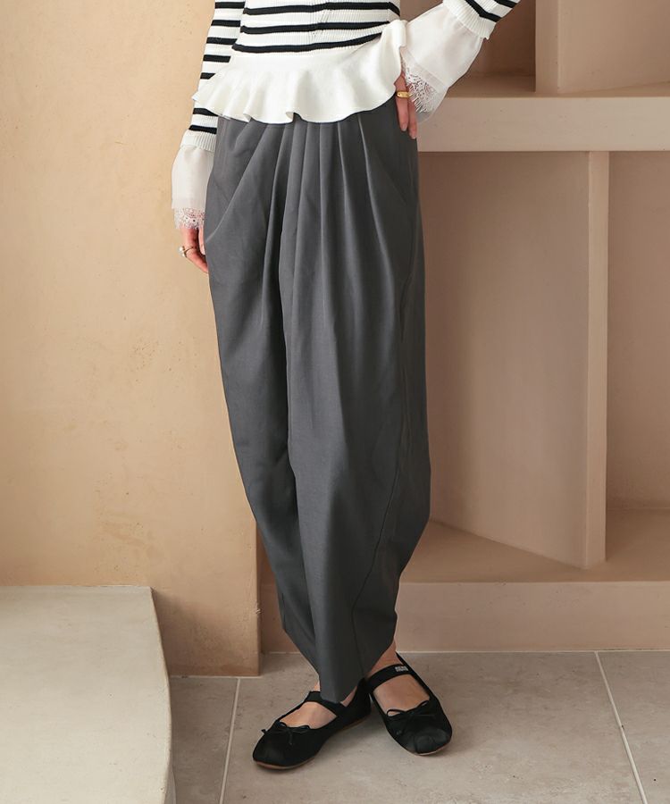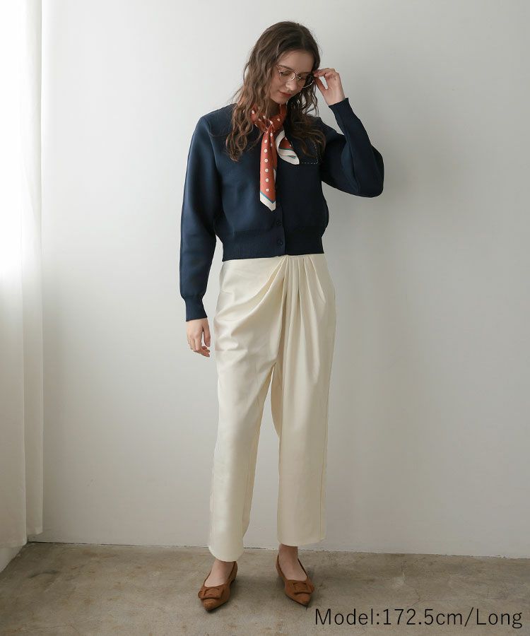 りなさんコラボのポワンジャケットに、落ち感のあるドレープパンツを合わせた大人のきれいめコーデ。シンプルながらもジャケットで華やさを◎