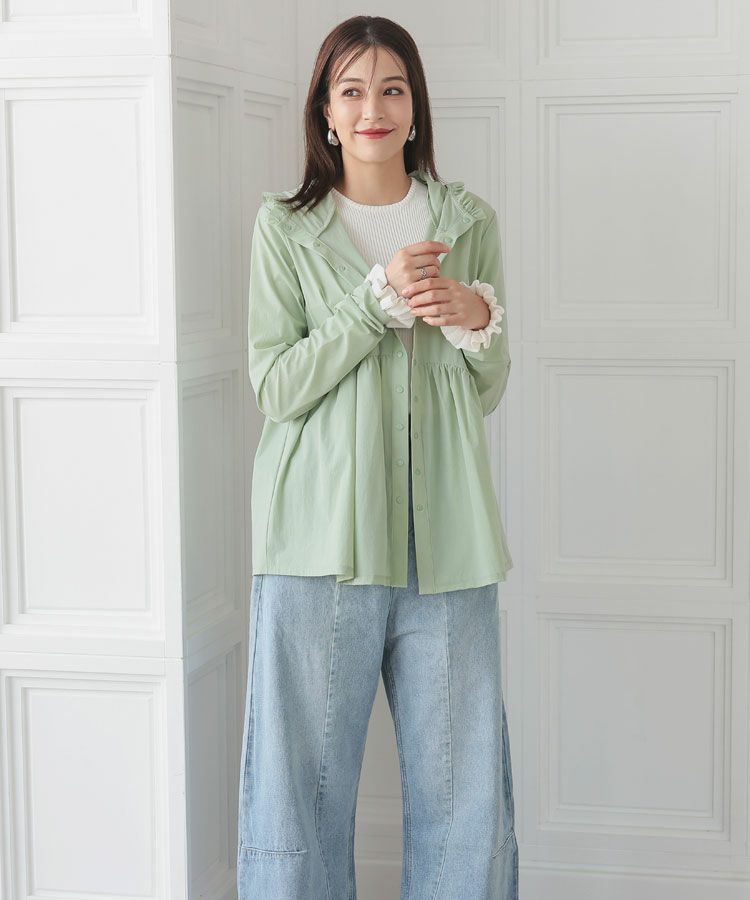 小さめのフリルが一周施されたフードは、被るとよりしっかりと紫外線から守ってくれます。