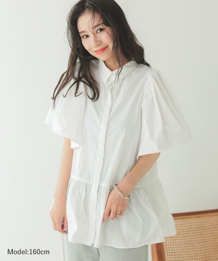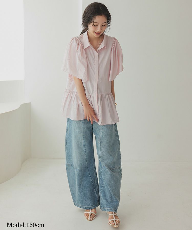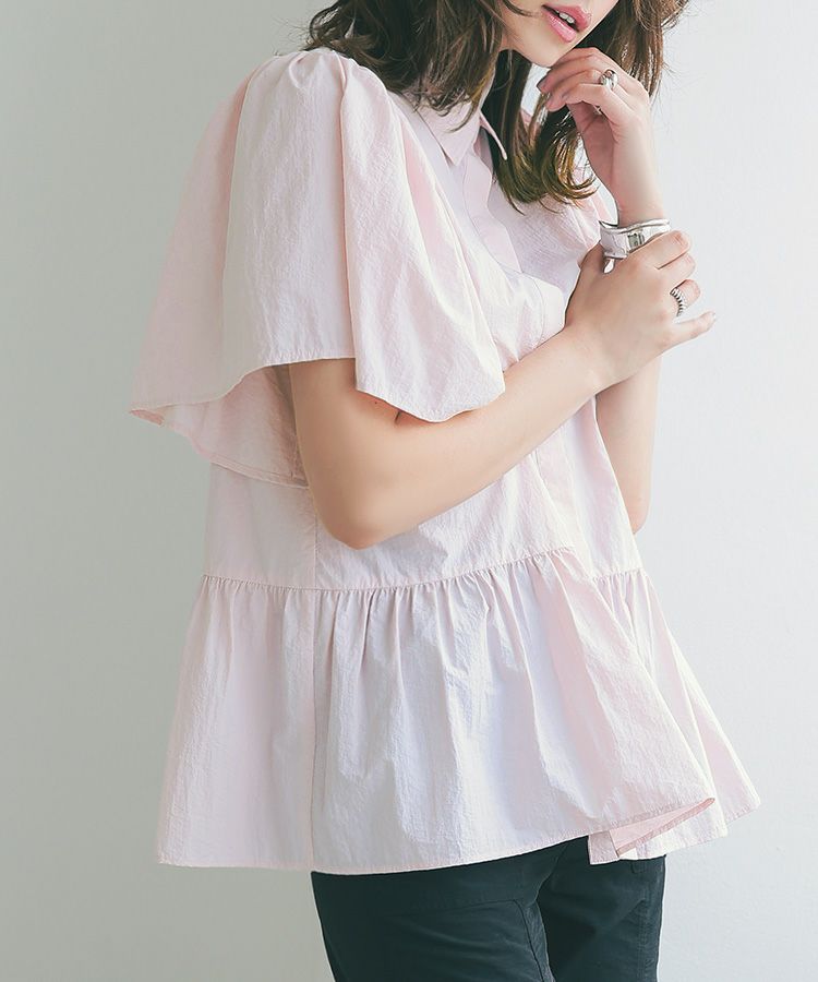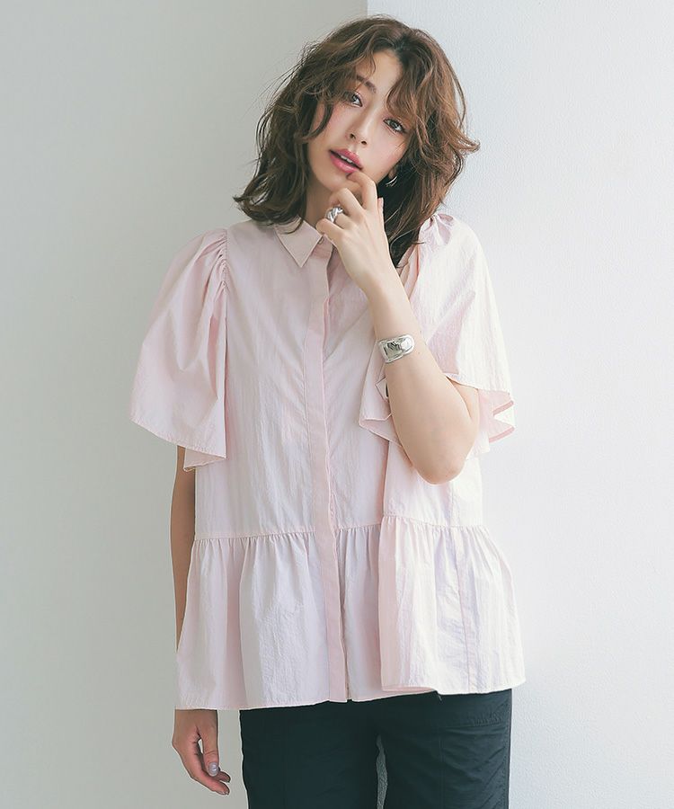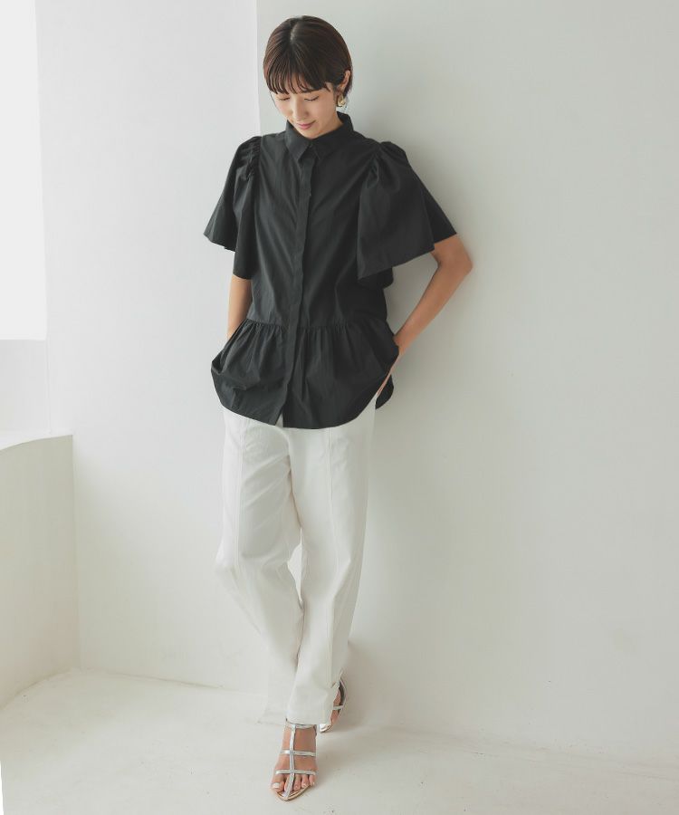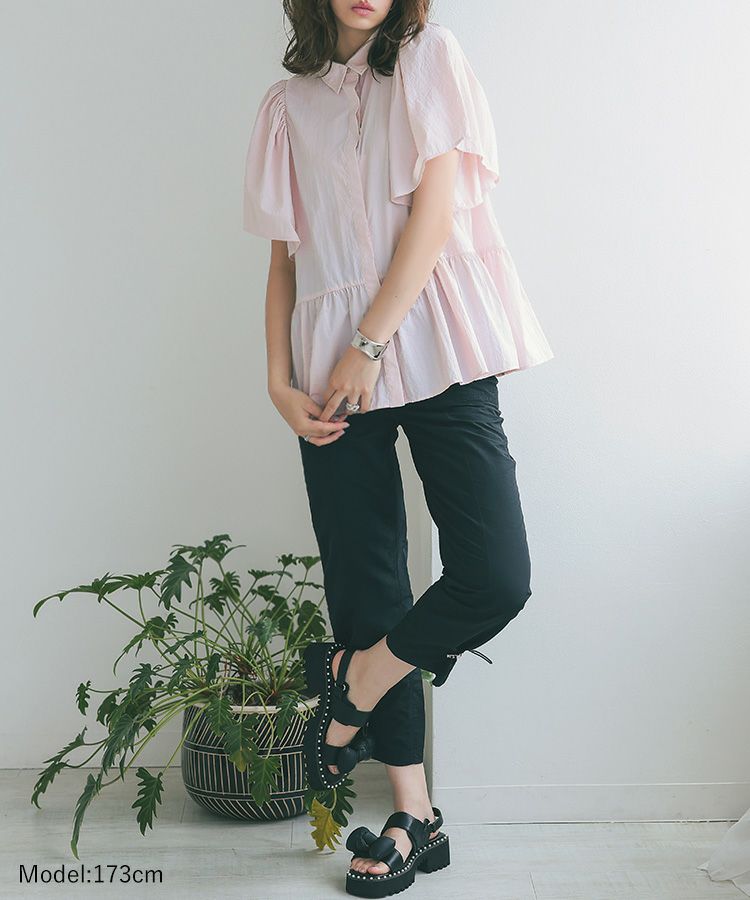 ふんわりした袖と裾のシルエットがかわいい撥水ブラウス。 スッキリ見えするクロップドパンツでコーデするとバランス◎ ウエスト総ゴムで、楽なパンツは暑い日の必須アイテム。