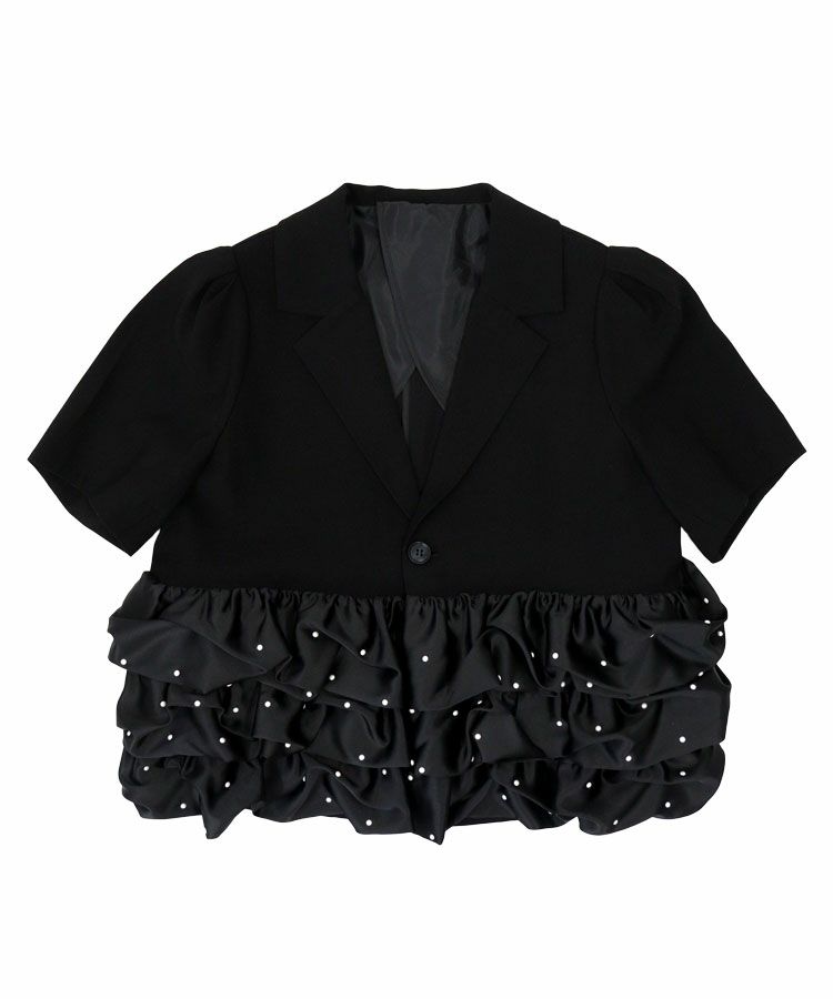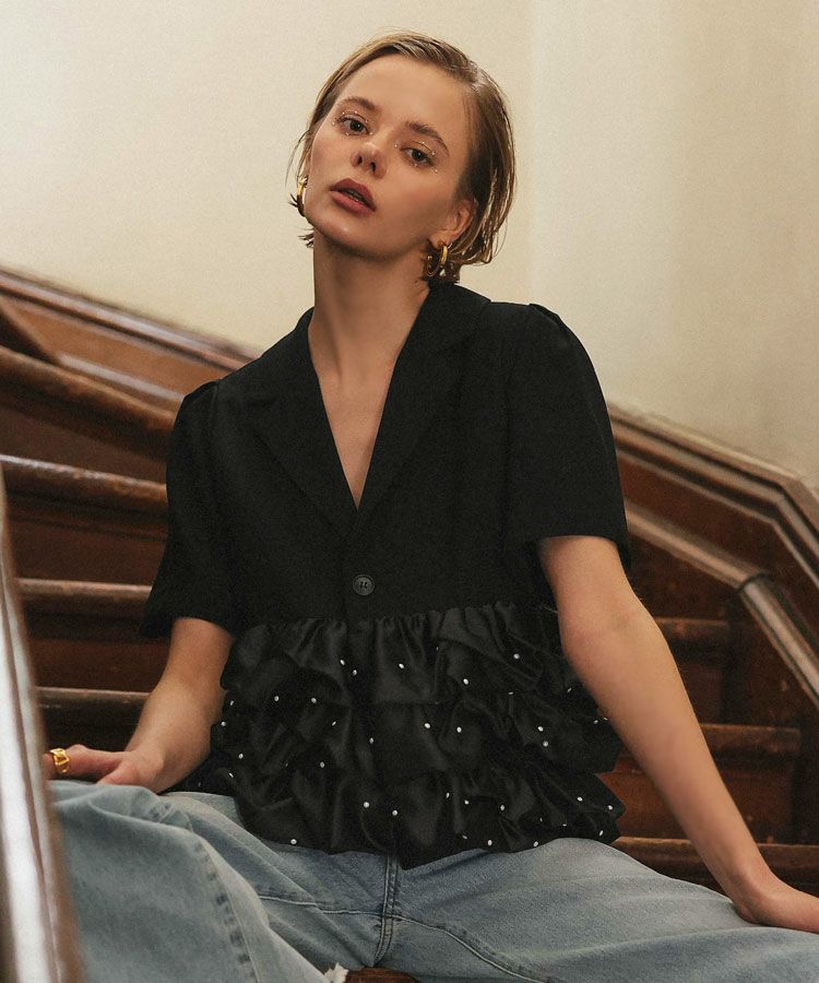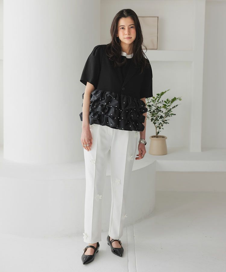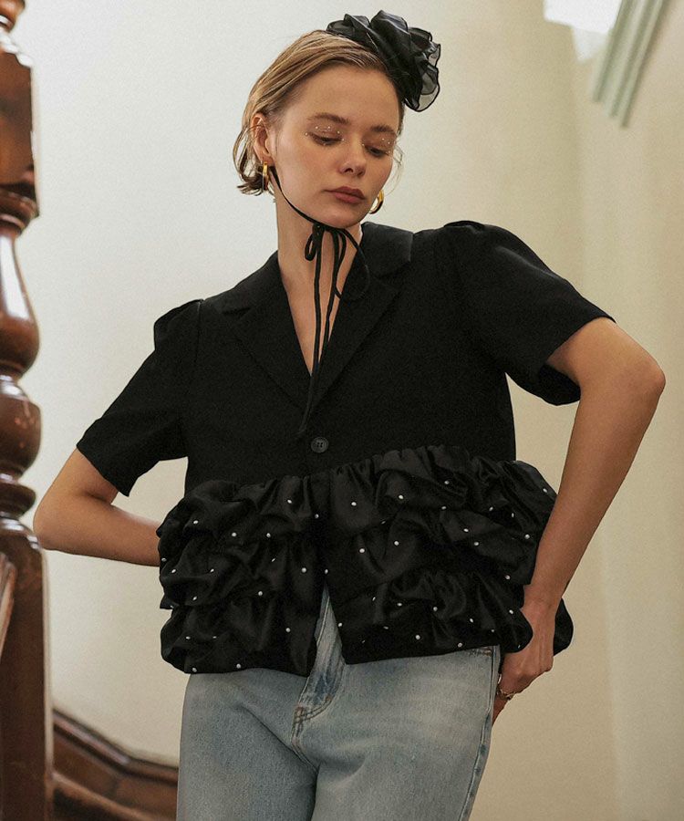フリルジャケットは羽織るだけでいつものスタイリングに品をプラスしてくれるアイテム。真夏の冷房対策としても◯程よい甘さがタイプです。