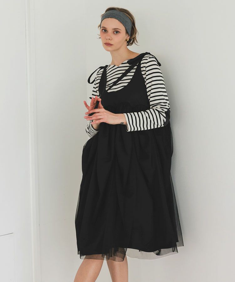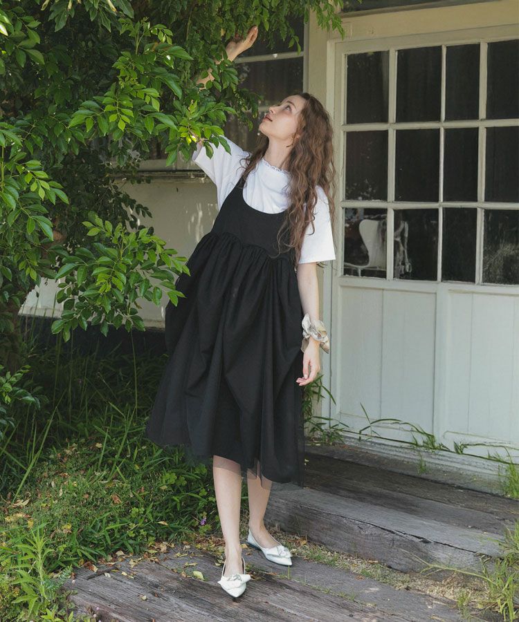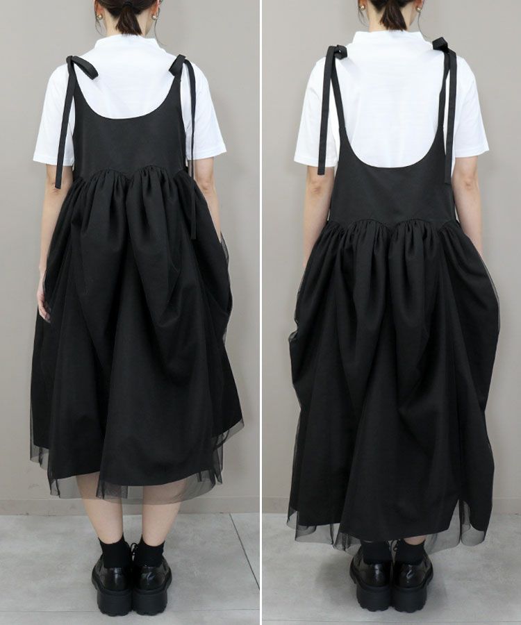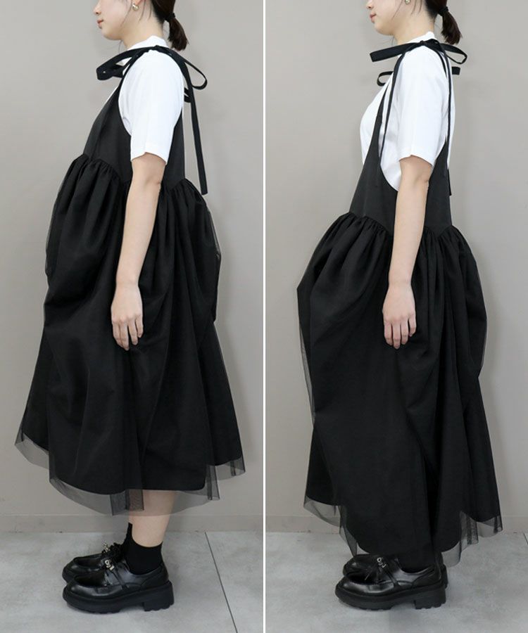 ハリ感のある素材ならではのボリュームとチュールのドッキングがポイント。