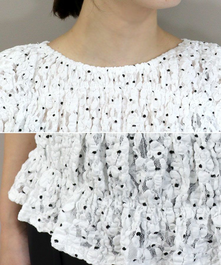 レーストップスは細見え-3kg見え!!トップスがコンパクトなので、ボリュームのあるみくエリさんコラボデニムとの相性抜群。スタイルアップするコーデです。