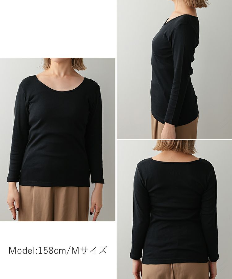 襟ぐりが少し広く深めに設計しているので、どんなトップスにも合わせやすいので寒い時期のインナーとしてオススメです。