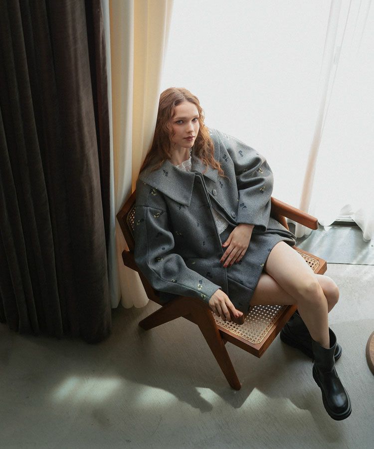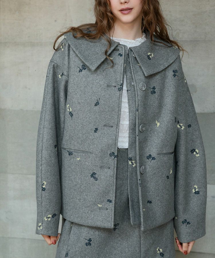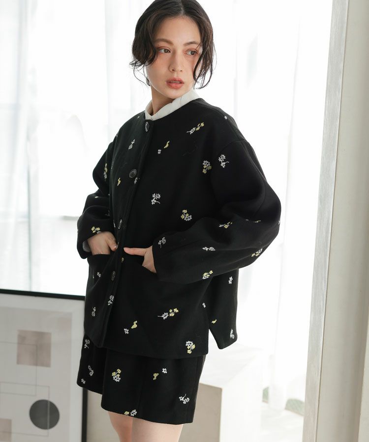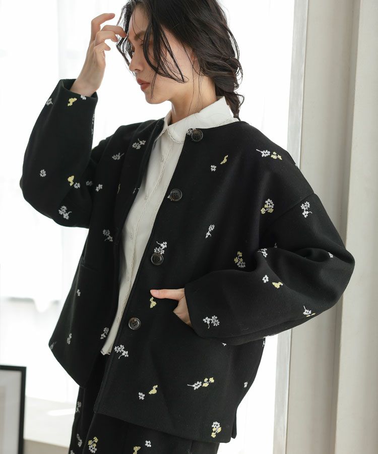小花刺のバランスがキレイ目なのに可憐さを感じさせてくれるノーカラージャケットに仕上げました。