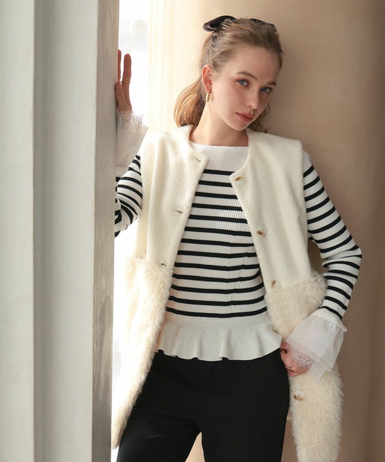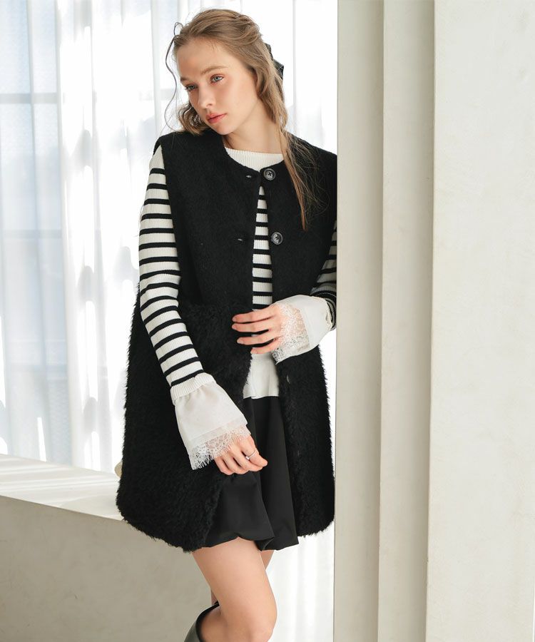 ふんわりとしたボアと毛足が長いシャギーをドッキングさせ表情豊かなロングジレ。