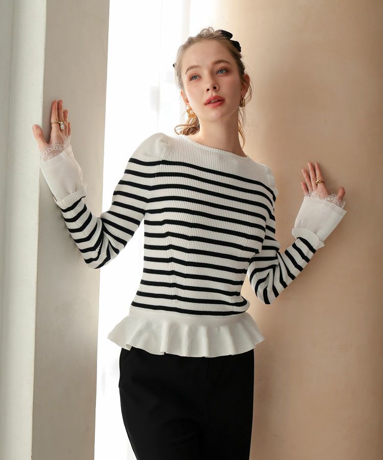 デザイン性のあるパフスリーブにレースがドッキングされたニット。