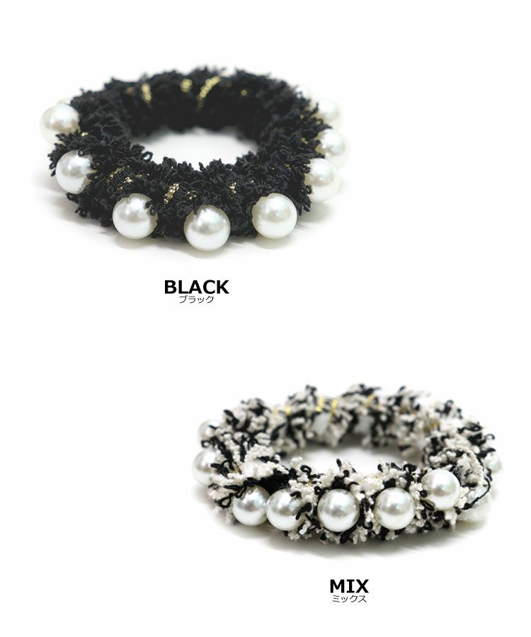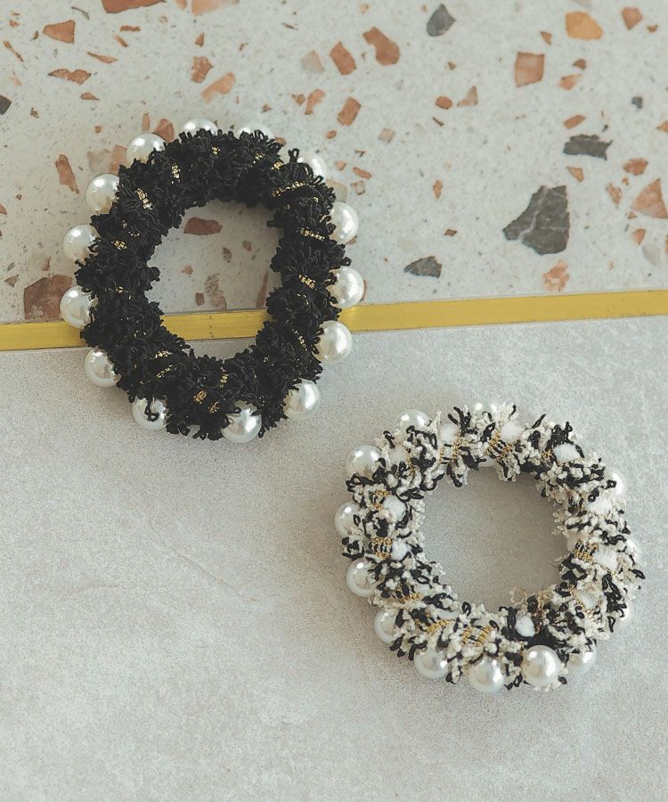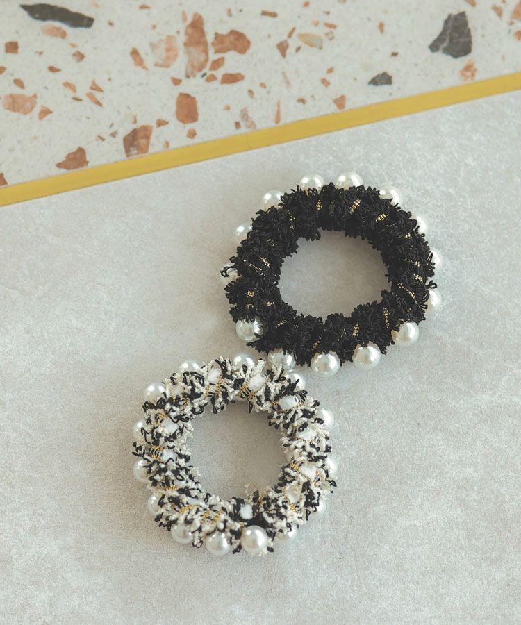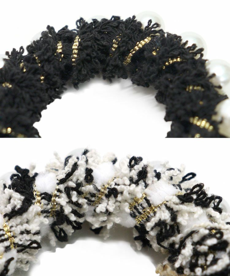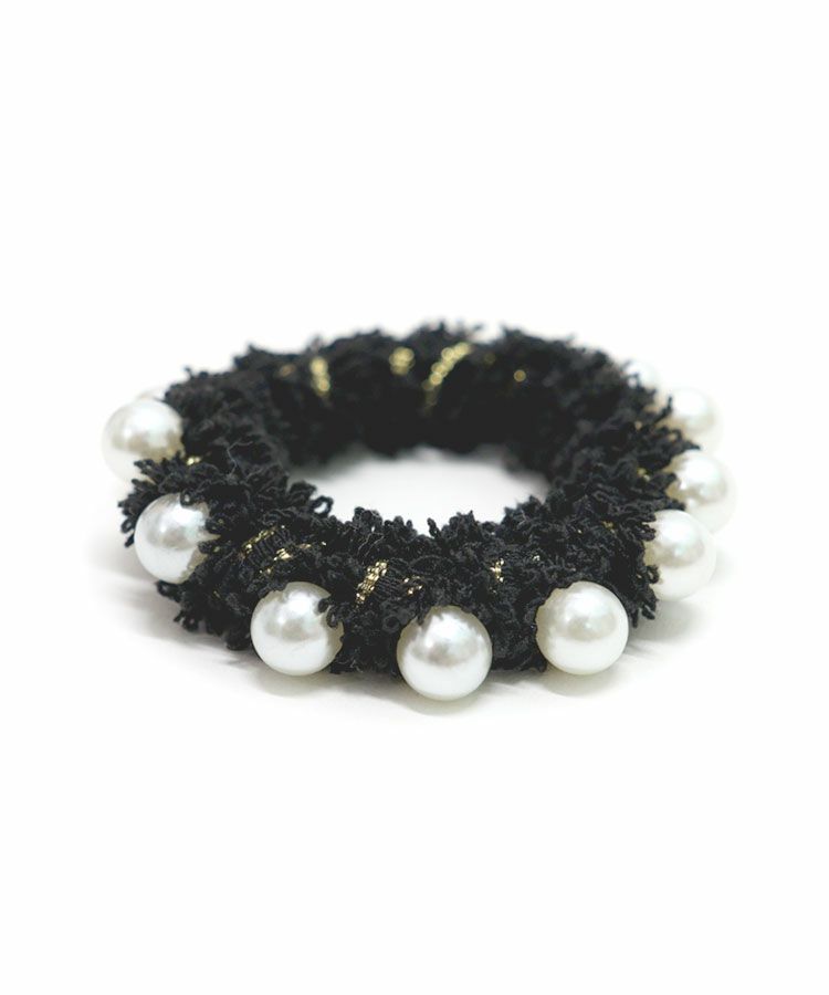 ラメ糸を織り込んだツイードと並んだパールモチーフが目を引くヘアゴム。