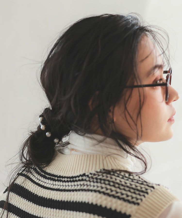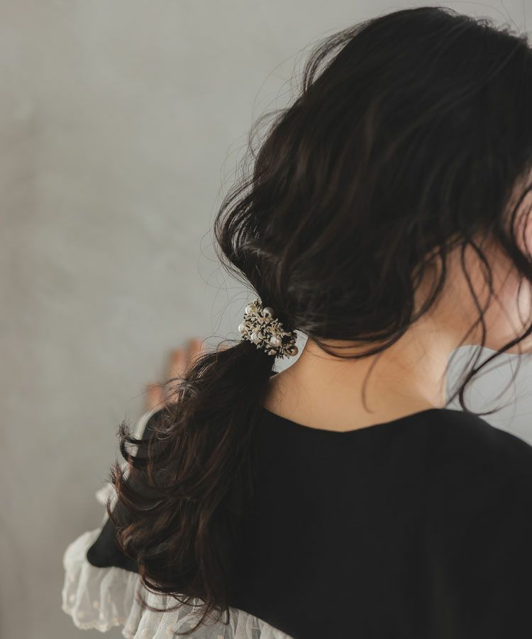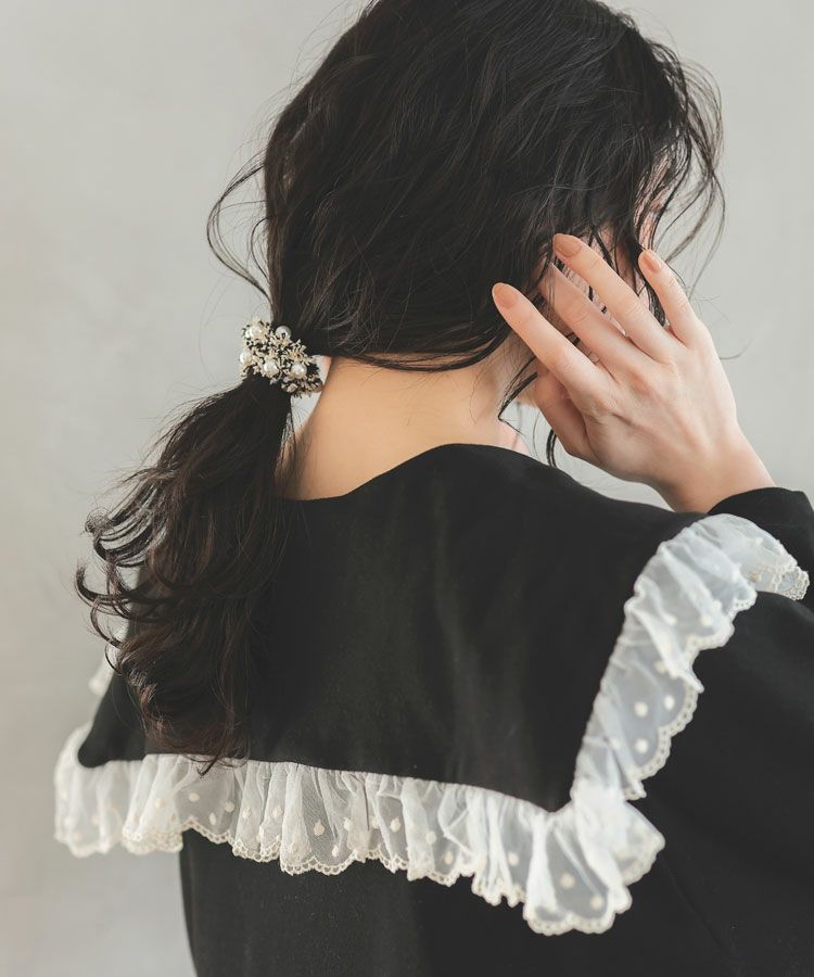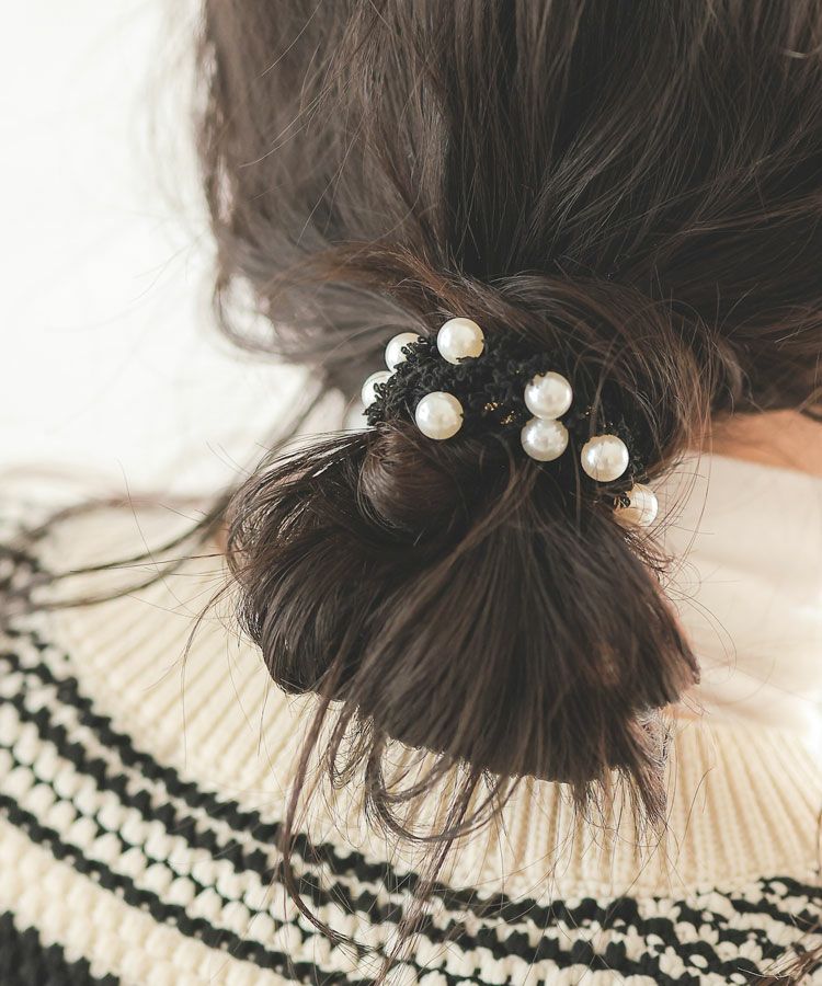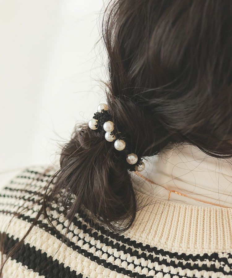 ラメ糸を織り込んだツイードと並んだパールモチーフが目を引くヘアゴム。