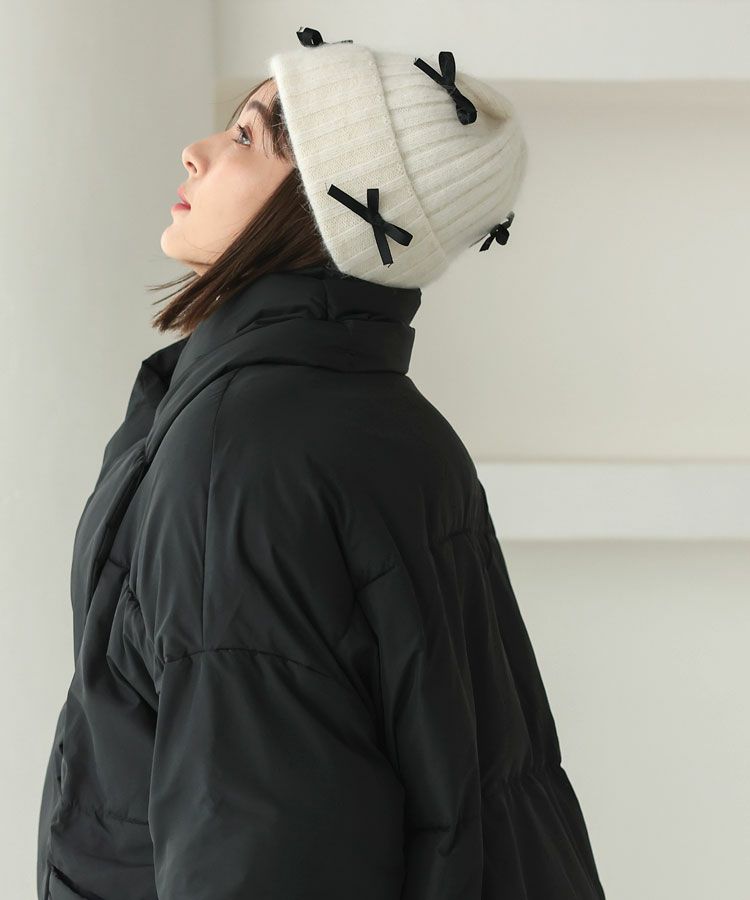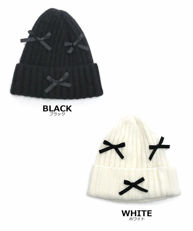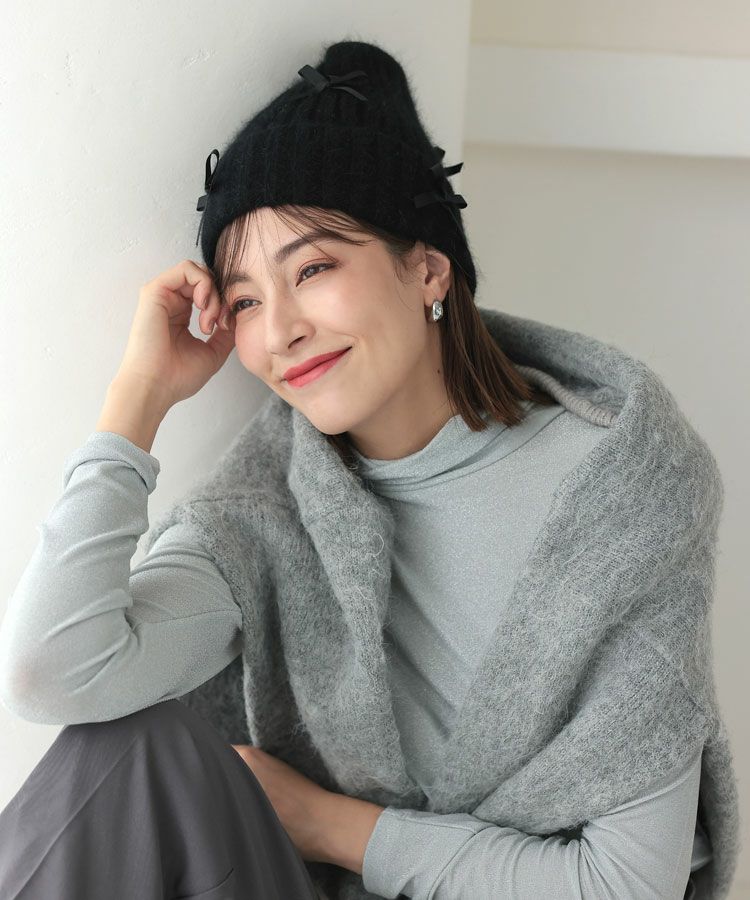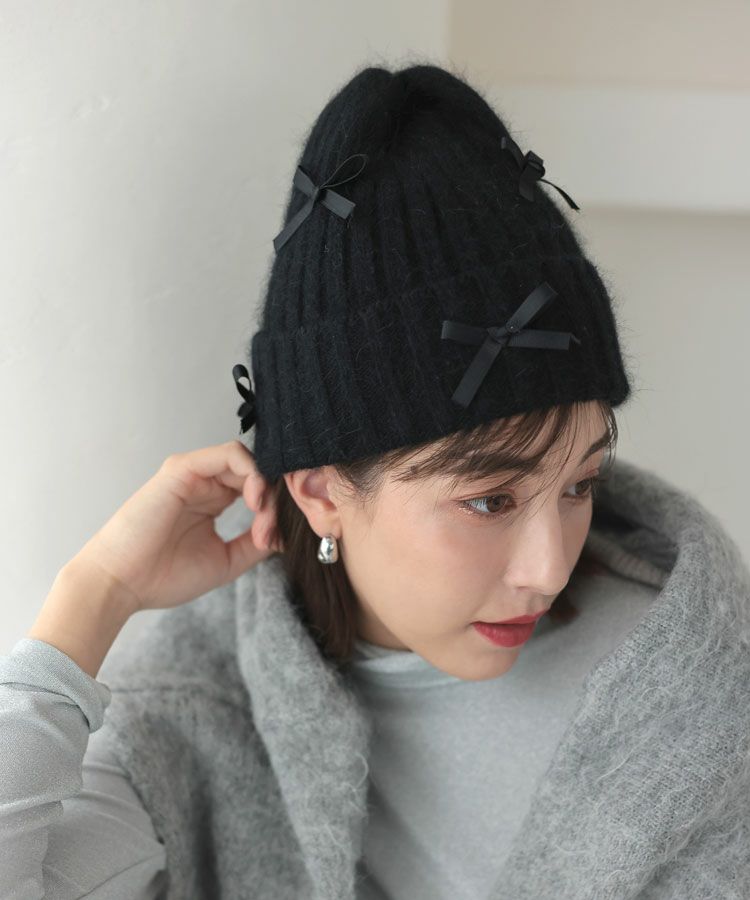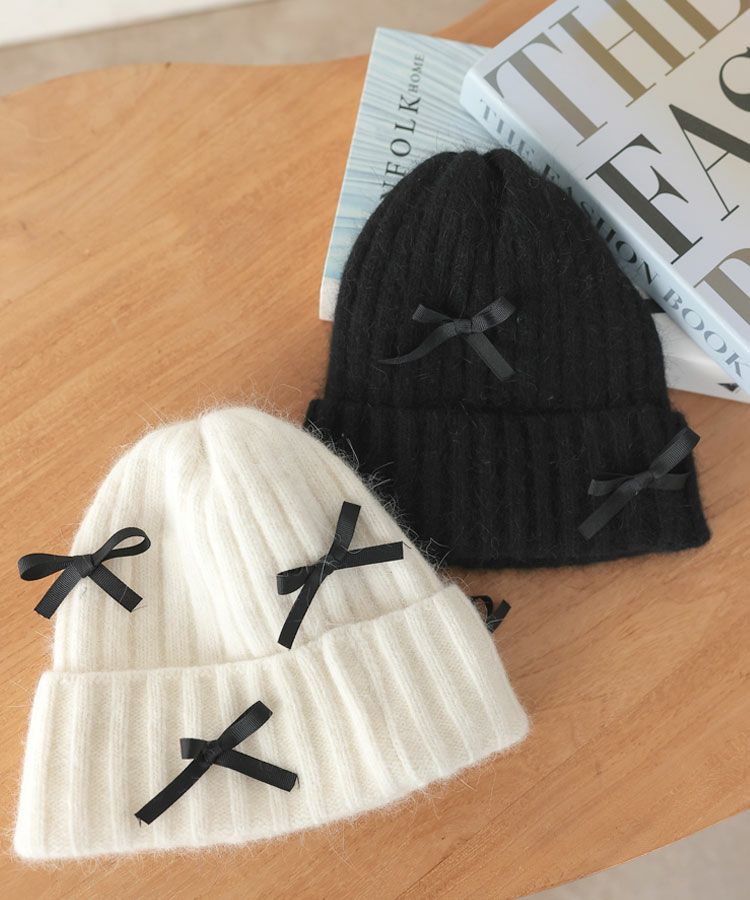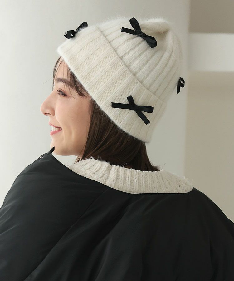 ふわふわアンゴラ素材のニットキャップにリボンが付きました。