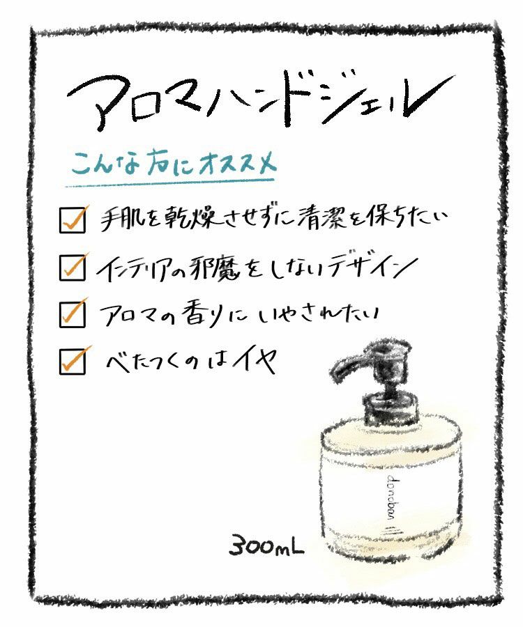 きれいな水で手を洗うことができないときに手を洗浄でき、手肌を乾燥させずに清潔にうるおすアルコールベースのハンドジェル。