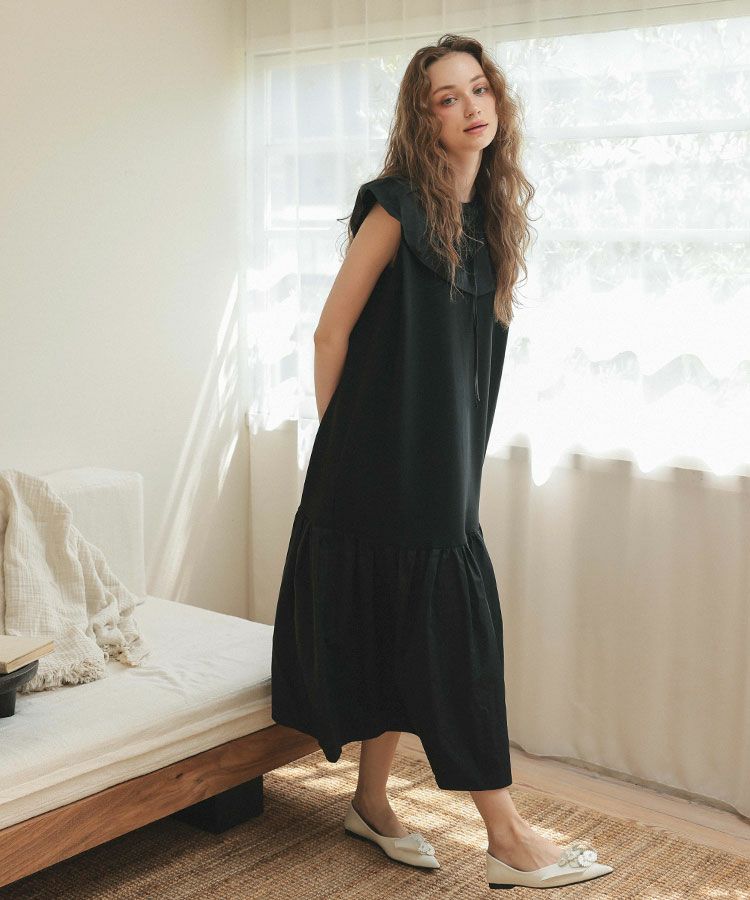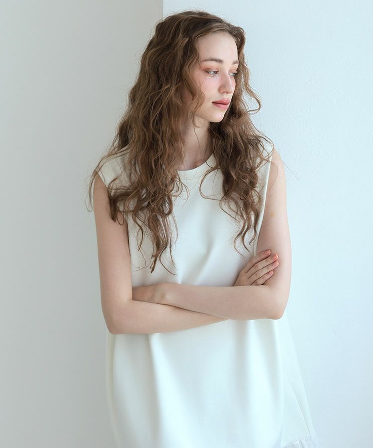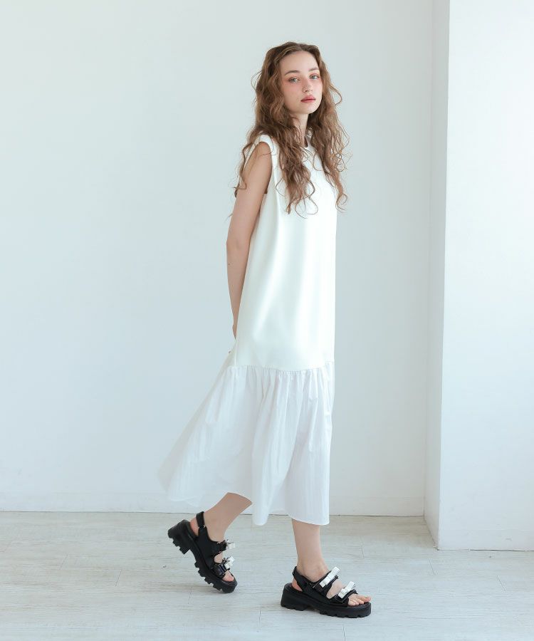 ボクシーノースリーブデザインのワンピースは、二の腕を限りなく細く見せてくれる優秀なデザインワンピース。