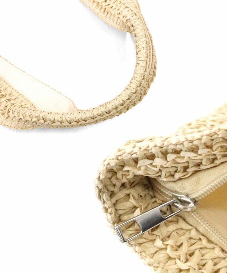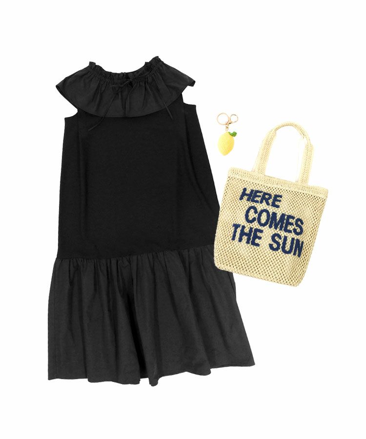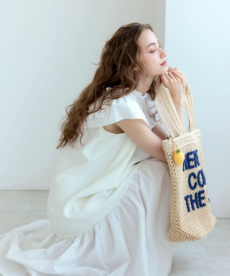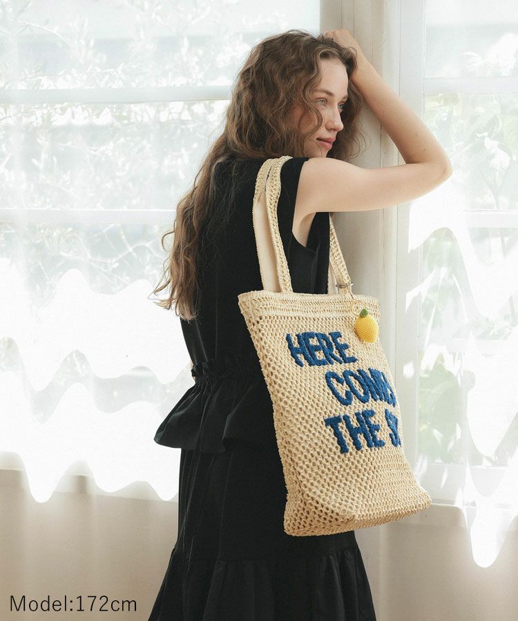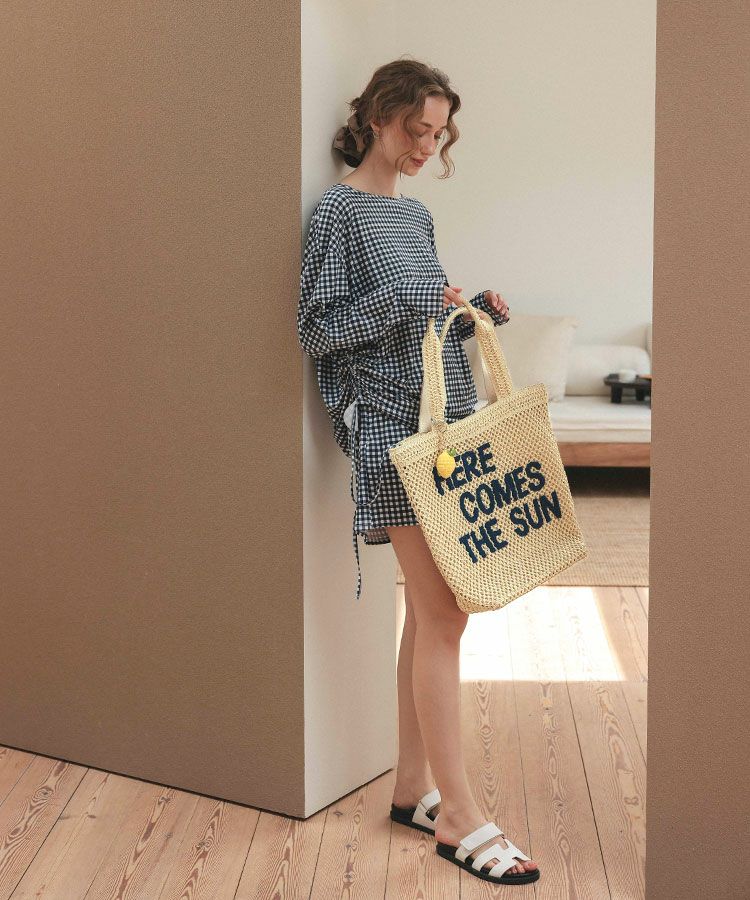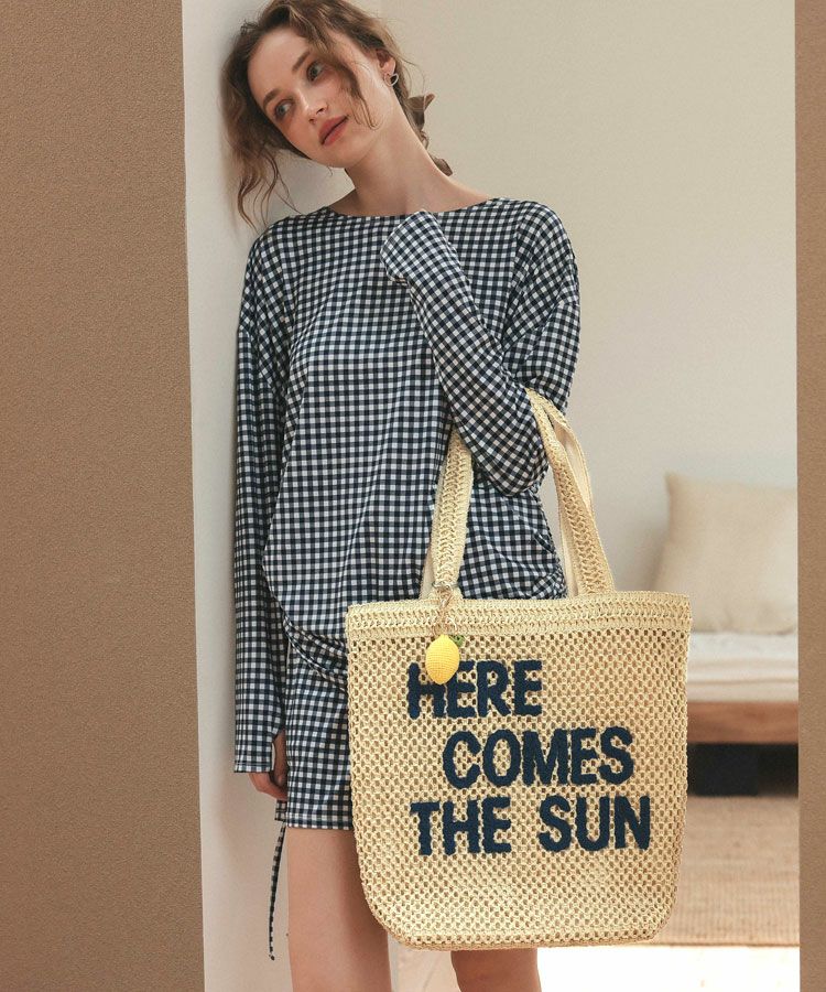 夏に持ちたいラフィア風素材に「HERE COMES THE SUN」の刺繍がデザインのアクセントになったトートバッグ。