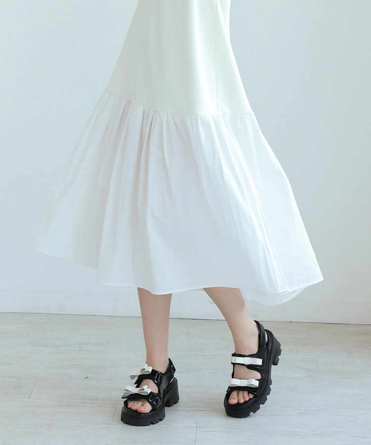 異素材でドッキングされた裾は、フレアシルエットが女性らしい魅力を引き立ててくれる1枚で主役級のアイテムです。