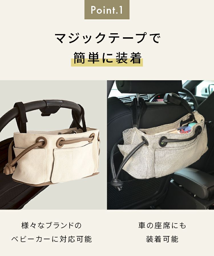 ベビーカー装着部分がマジックテープ式のため、車の座席にも装着出来るので、 おしりふきシートだけでなくティッシュやドリンクも 中に入れながら快適なドライブを楽しむことができます。