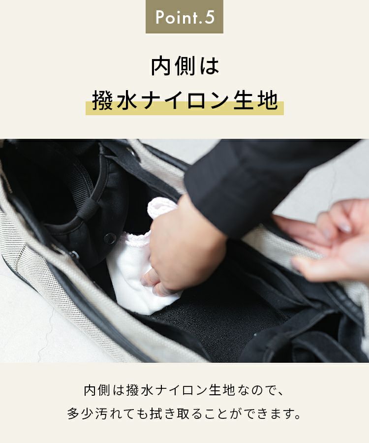 内部側は撥水ナイロン生地を使っているので、多少汚れても拭き取ることが可能。