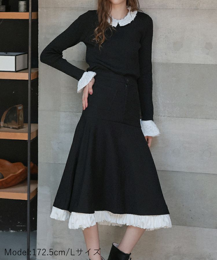 シンプルなブラックベースだから、カジュアルなニットと合わせる時は裾フリルを外して甘すぎず大人可愛いをアクセントに。