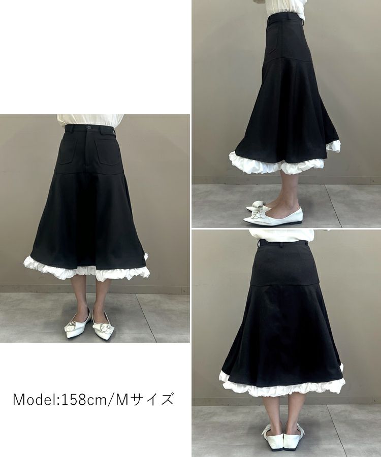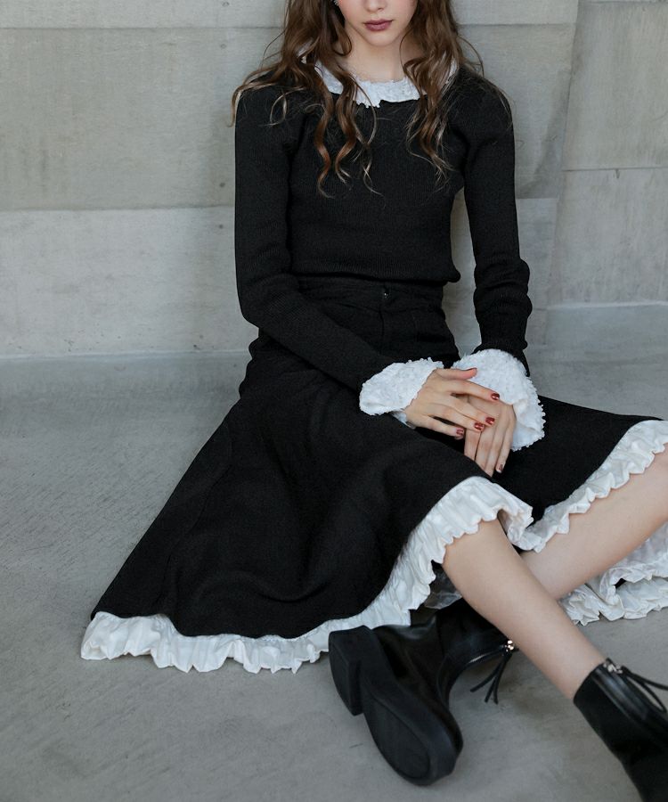 シンプルなブラックベースだから、カジュアルなニットと合わせる時は裾フリルを外して甘すぎず大人可愛いをアクセントに。