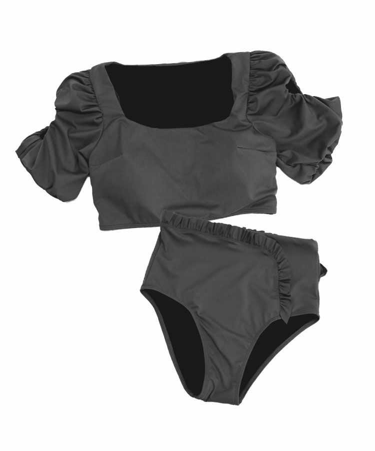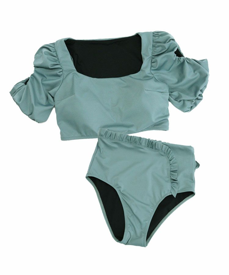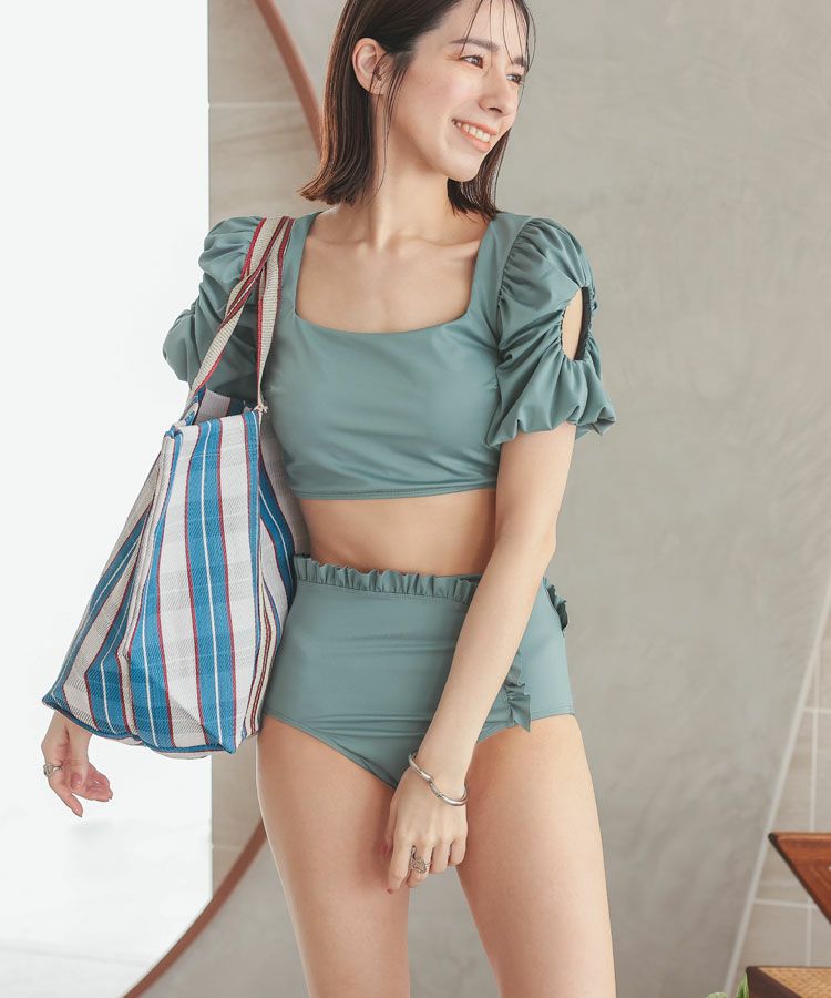 ハイウエストボトムは小さめのフリルデザインが1周施されているので、気になるお腹周りをカバーしつつ程よく肌見せがヘルシーな雰囲気に。