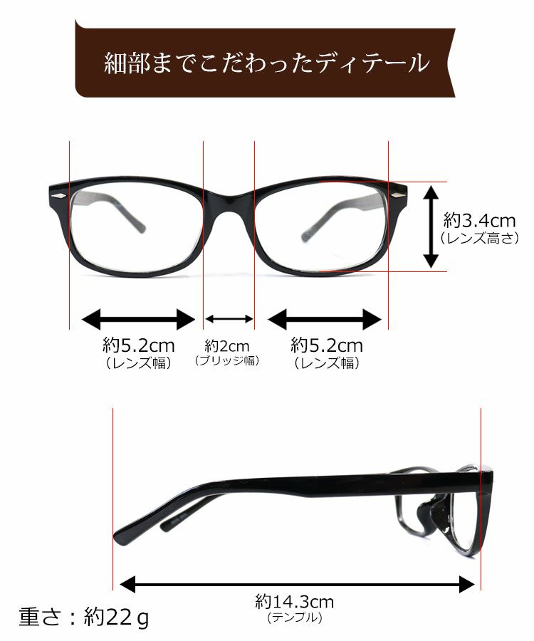 レンズ縦 約3.4、レンズ横 約5.2、ブリッジ 約2、テンプル 約14.3