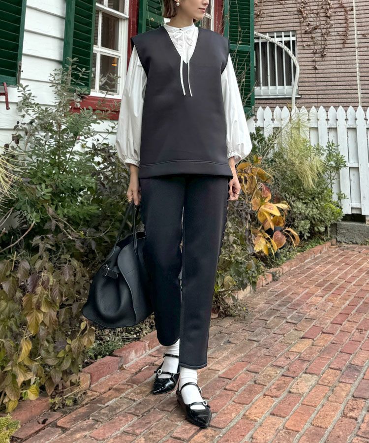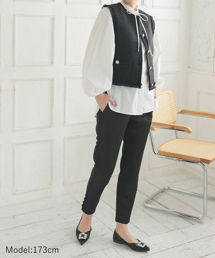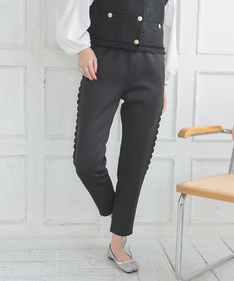 サイドのスカラップデザインがとても可愛いです。シンプルな黒パンツですが、さりげないポイントで女性らしさが出ます。生地はしっかりしていて伸縮性もあるので動きやすいです。普段Mサイズを着ていますが、ちょうど良いフィット感でした。オンオフどちらにも使えて大満足です。