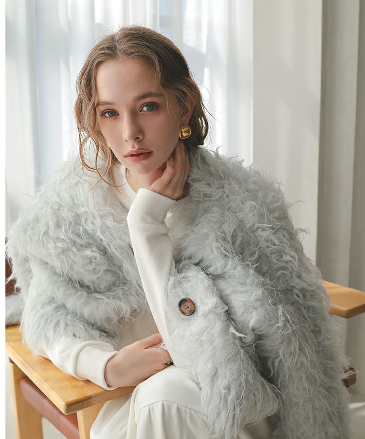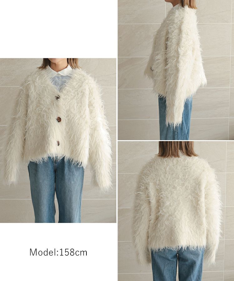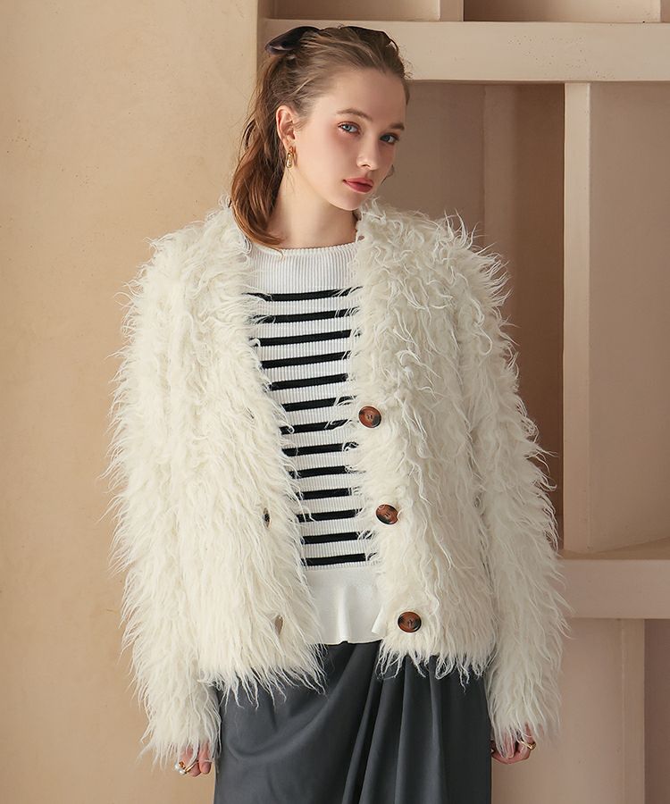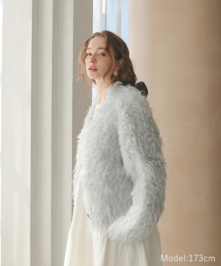 羽織るだけで柔らかなムードを纏えるフラッフィーカーディガンに、ゆるっと落ち感のあるリブニットが好相性。スラッとしたラインに余裕のあるシルエットが◎