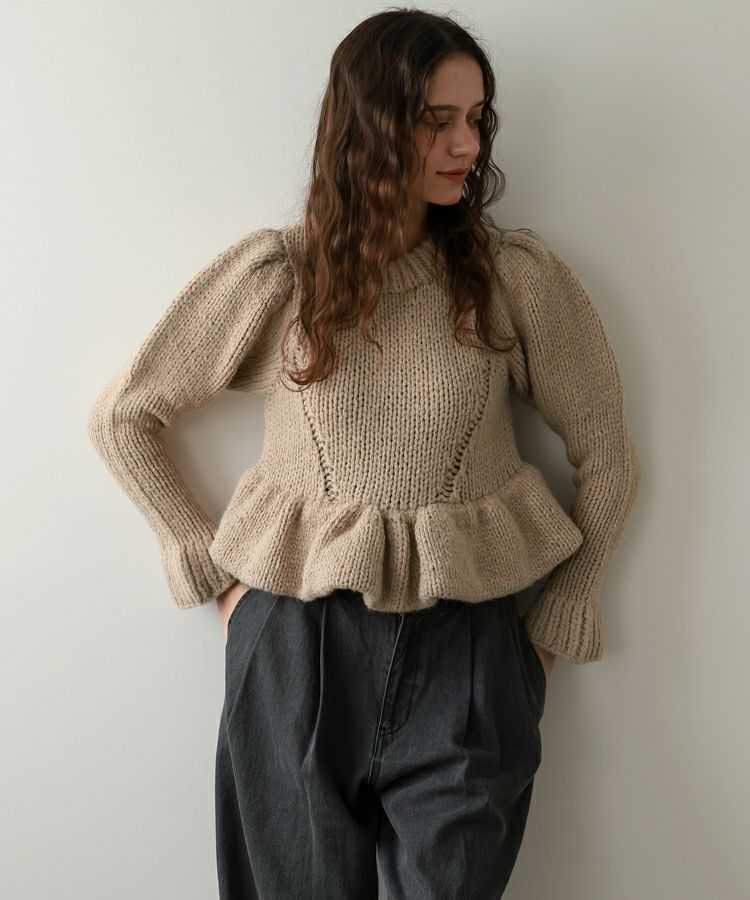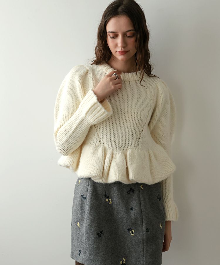 手編みの温もりを感じるホワイトのハンドメイドニットに、ドットキルトパンツの軽やかな表情をプラス。やわらかさと遊び心が程よく調和した、冬のこなれカジュアルスタイルです。
