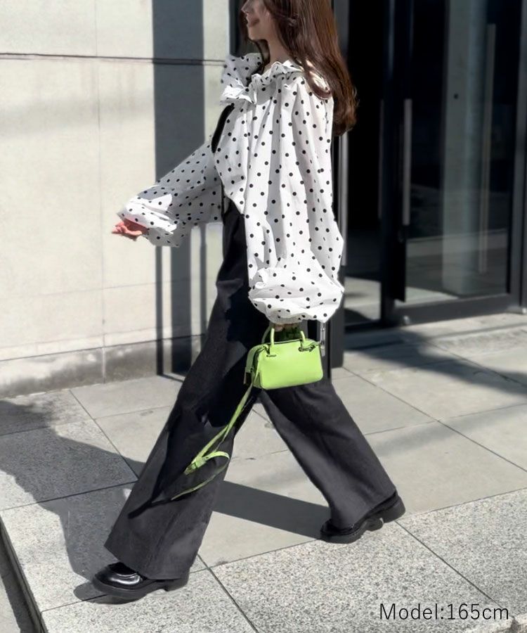 襟ぐりにはたっぷりとギャザーを入れ、首周りにボリュームを作る事により小顔効果に。