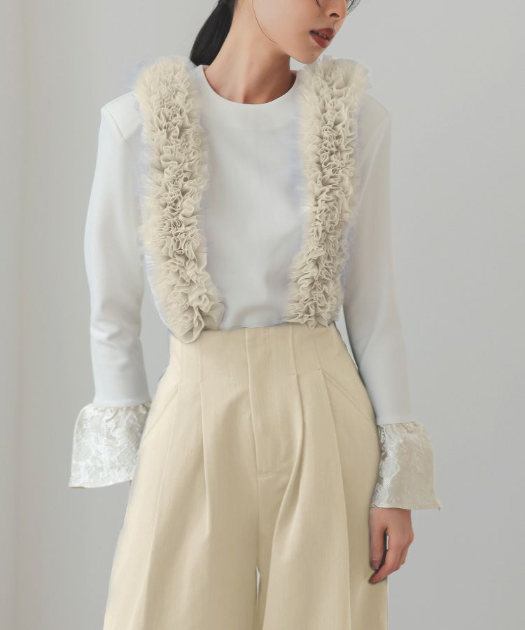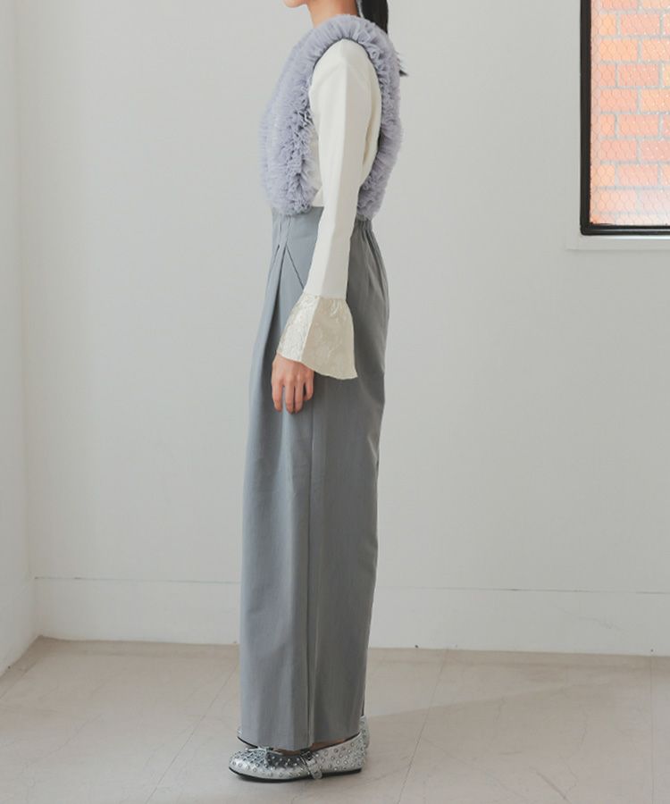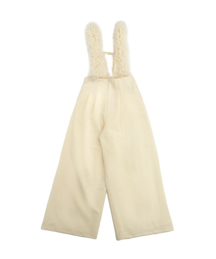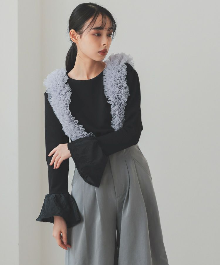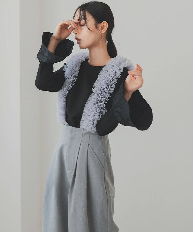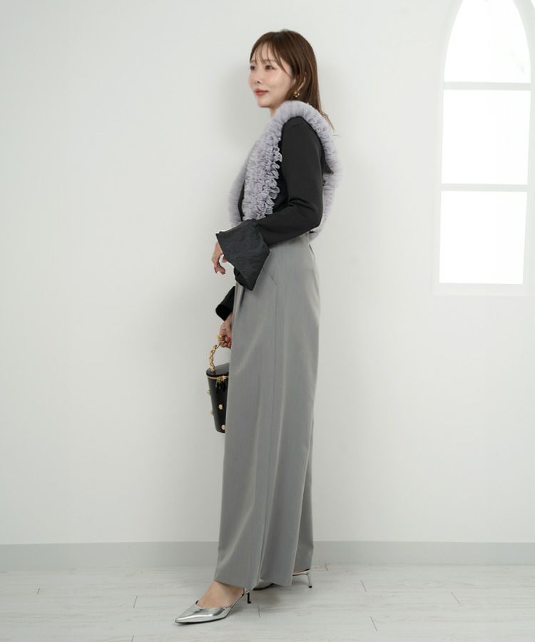 まきさんコラボのチュールフリルサスペ付きハイウエストワイドパンツをサスペンダーを取ってフェザーペプラムトップスと合わせてみました。 このワイドパンツは形が感動するほど綺麗で脚長効果抜群!
