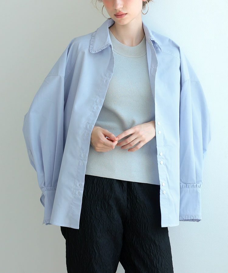 軽やかな着心地と上品なディテールが魅力の撥水フリルオーバーシャツ。