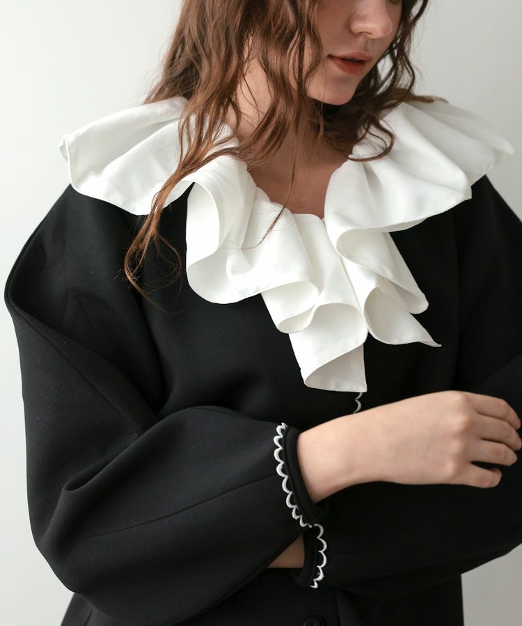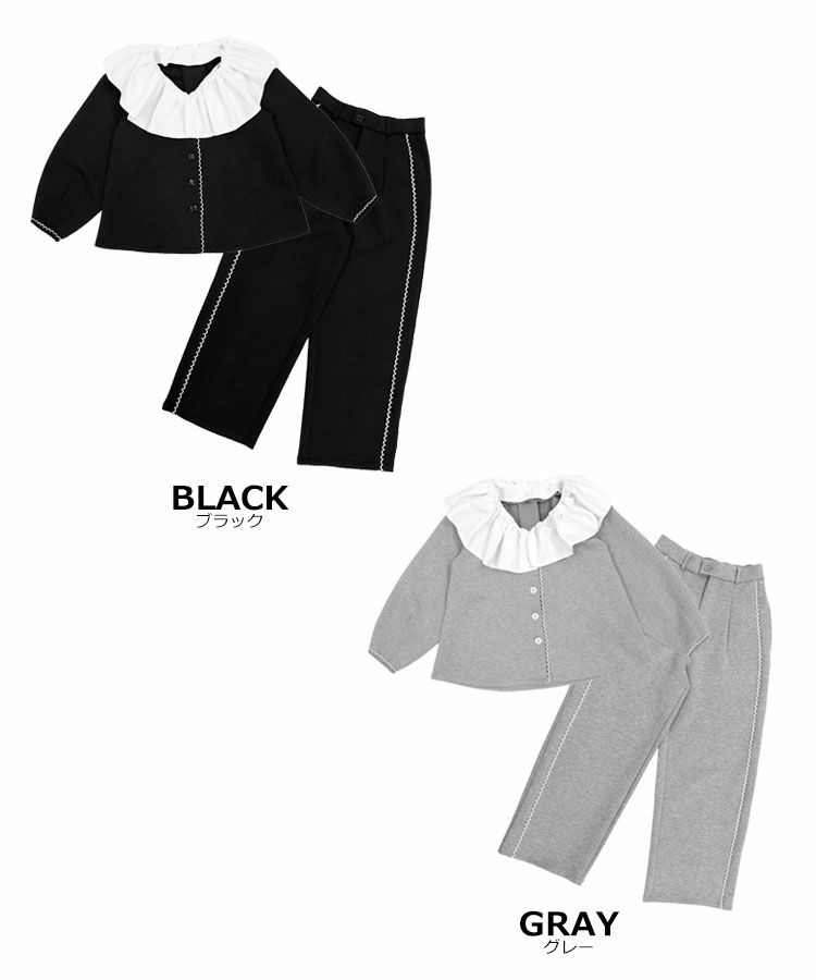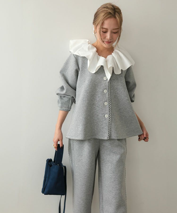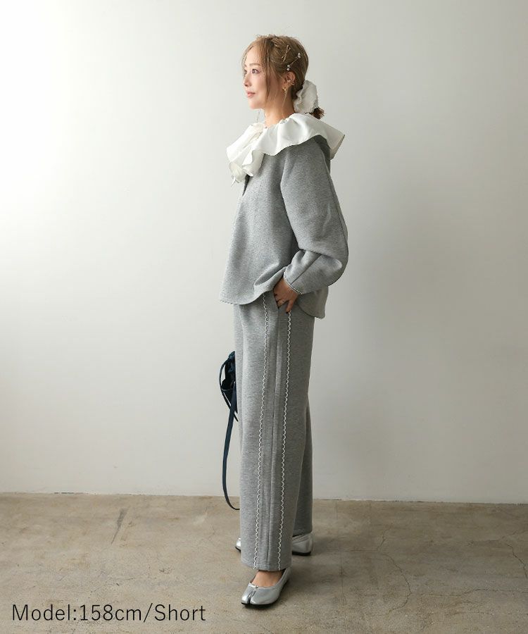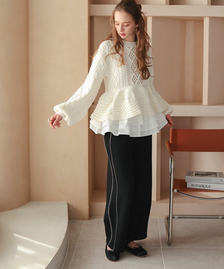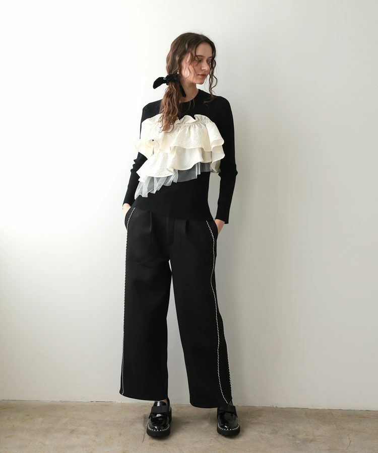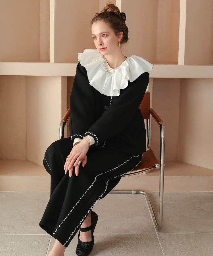 レースなしですっきりな表情が魅力のブラックセットアップに。縦のラインがさらに強調され、サラッと着るだけで大人の余裕漂うスタイリッシュなコーデに。