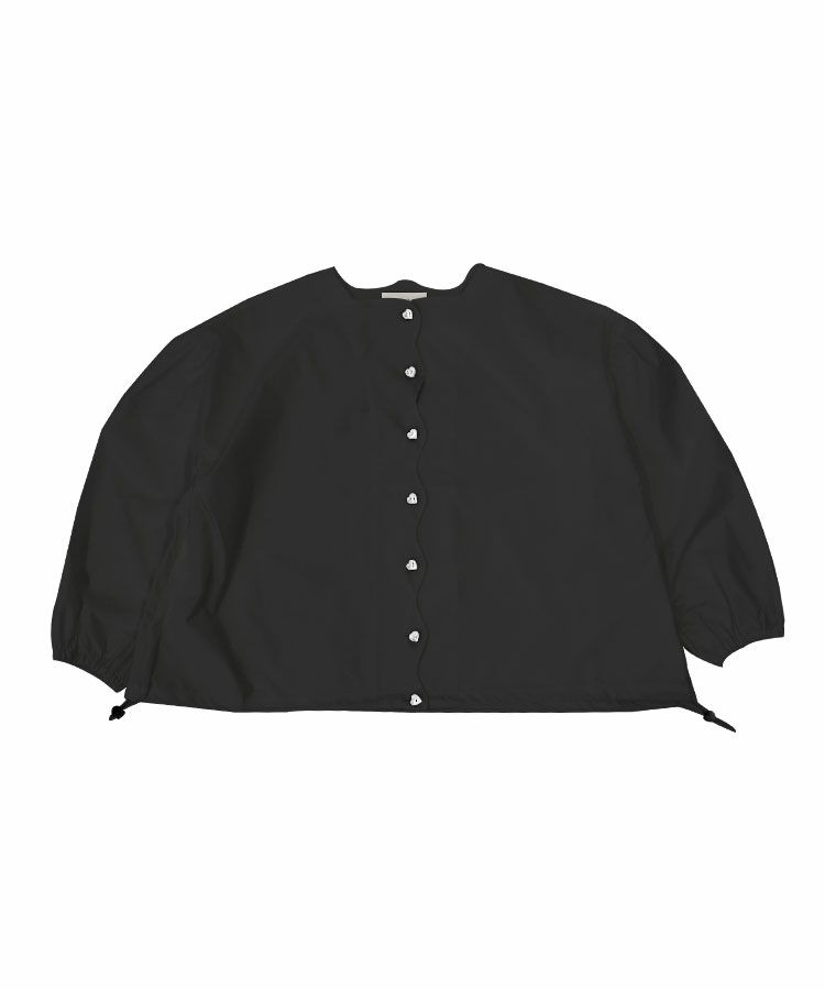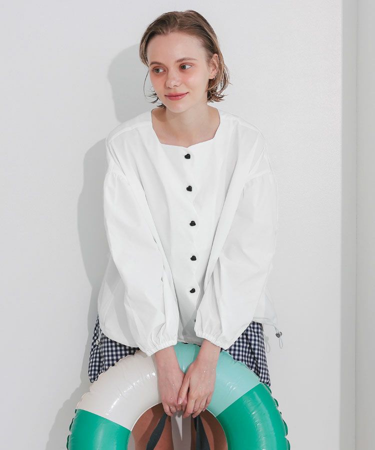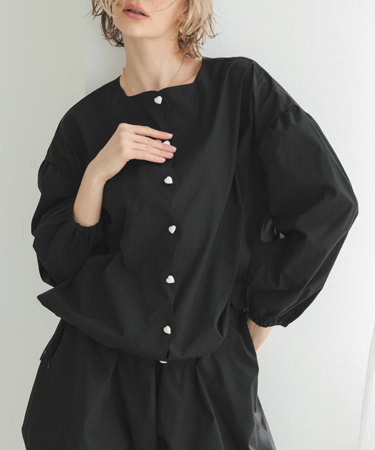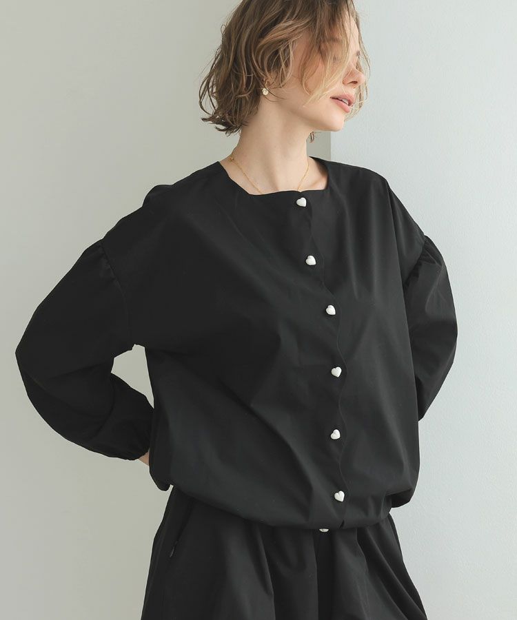フロントのスカラップデザインとハートボタンが、大人可愛いデザイン性と機能性を兼ねそろえているブラウス。