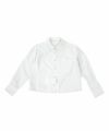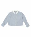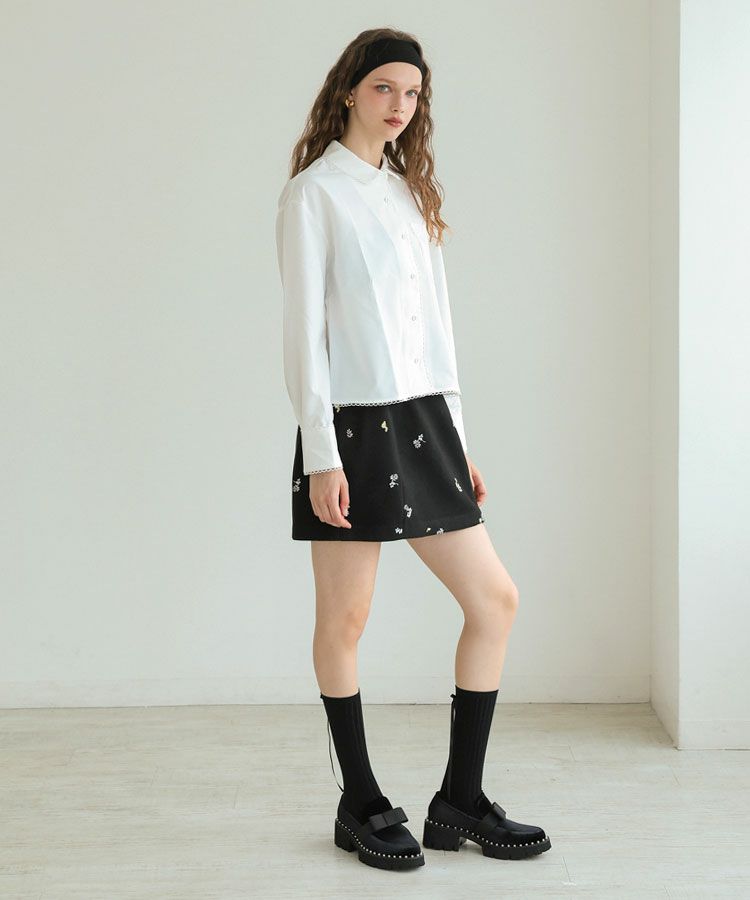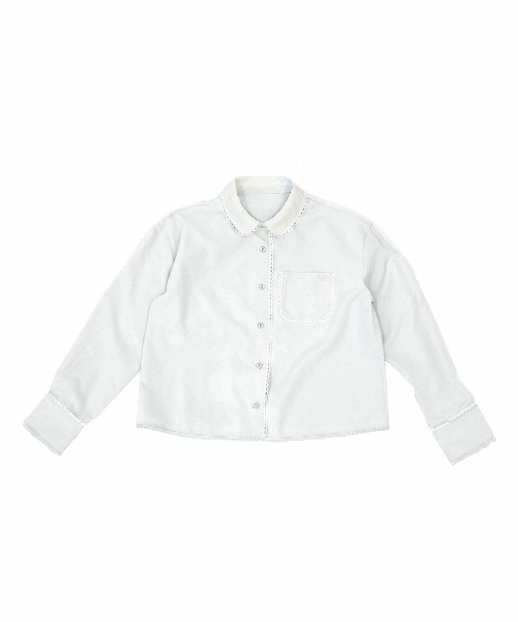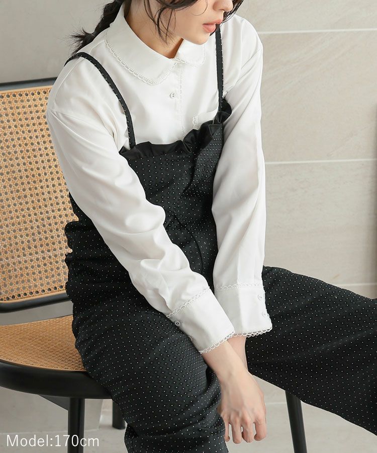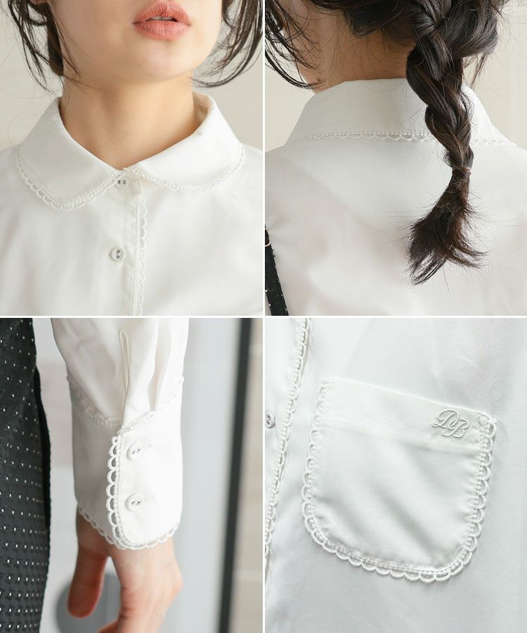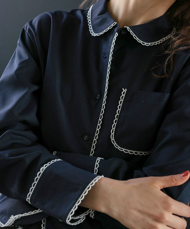 スカラップデザインが目を惹くブルーシャツに、落ち感のきれいなキャメルパンツを合わせた大人フェミニンな着こなし。ロングパールネックレスで品よくまとめたバランスの取れたコーデ。