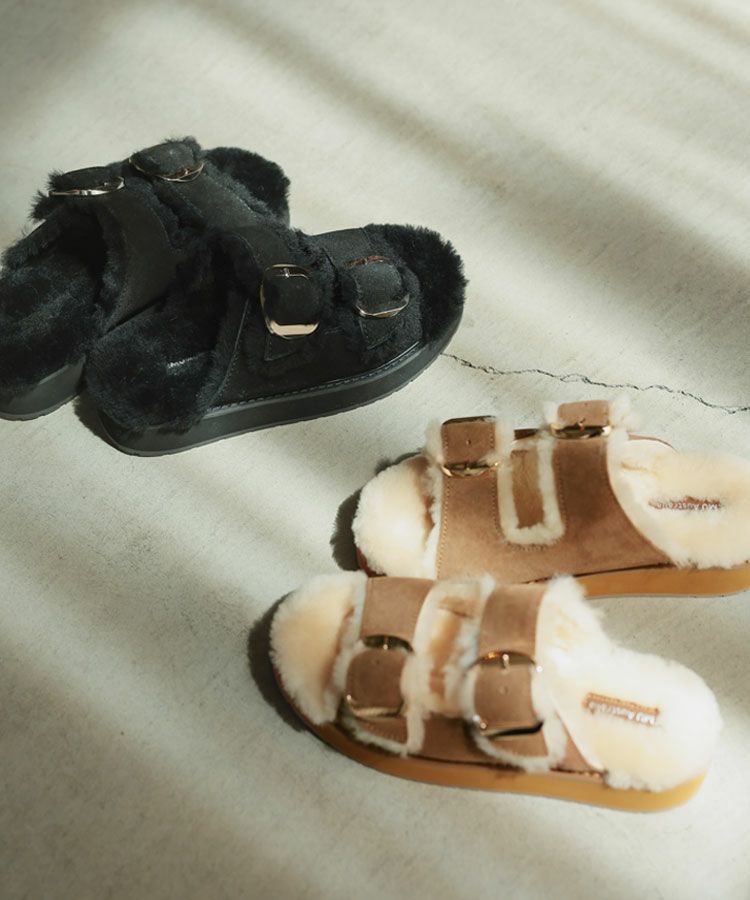 全体にあしらわれたふわふわのファーが見た目にも暖かく足元に贅沢な感触をプラス。