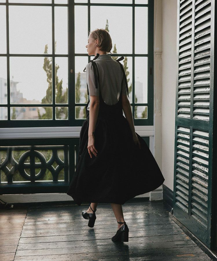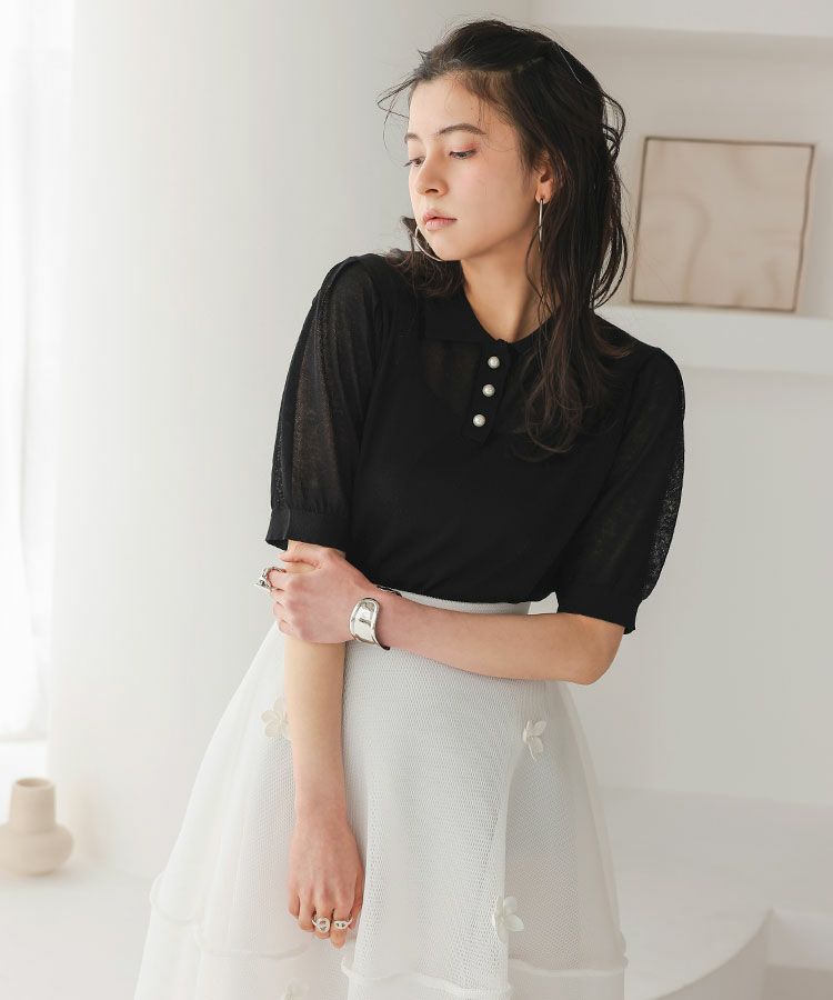 Donobanらしい大人ガーリーなパールボタンは、開け方や合わせるボトムで雰囲気を変えられます。
