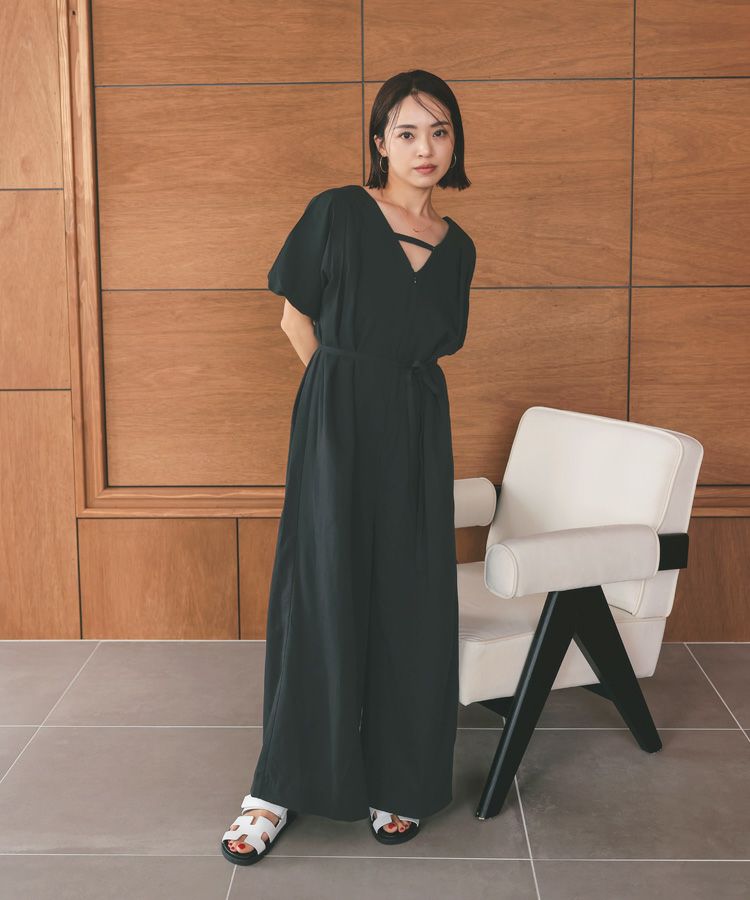 夏のお出かけにぴったりなオールイワン。 ウエストのリボンを外してゆるっとしたスタイリングにしました。 夏の少し焼けた肌に似合うニュアンスカラーもお気に入りです。
