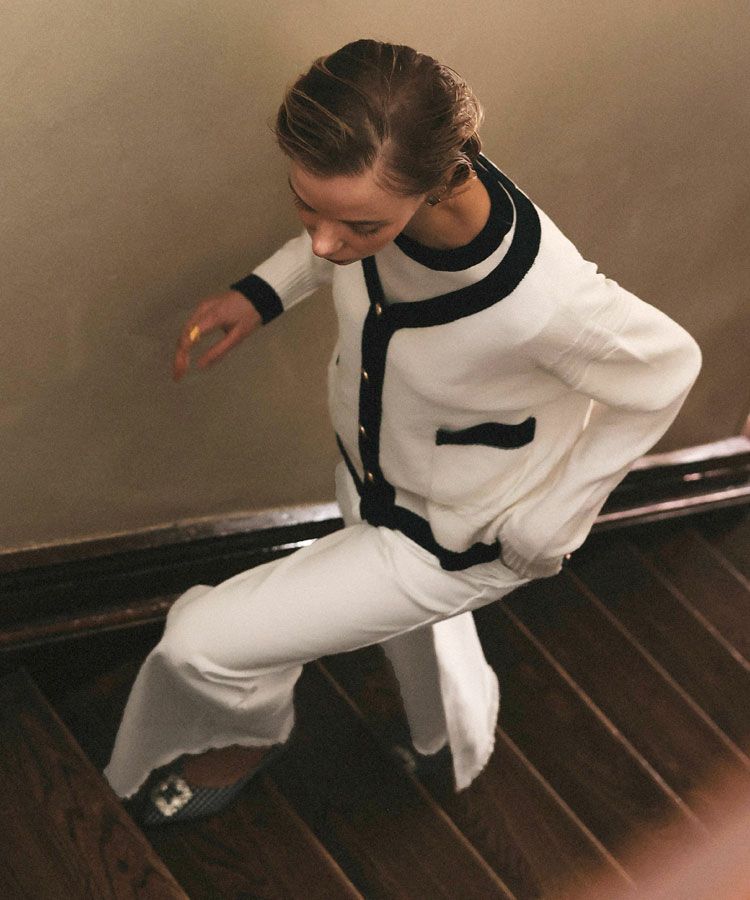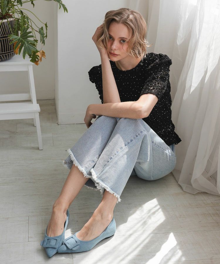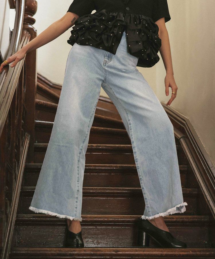 ドット柄の可愛さとフレアシルエットの華やかさをデニムで程よくカジュアルダウン。甘めのトップスをデニムでラフに仕上げた、大人かわいいミックススタイル。