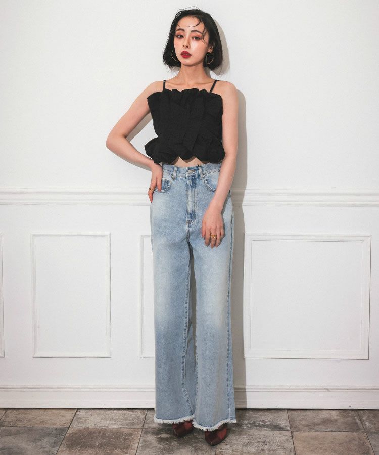 ドットレースのトップスと脚長効果抜群の撥水デニムはどちらもスタッフから大人気アイテム!レースのサスペンダーは夏のシンプルコーデを格上げしてくれそうなのでたくさん着回したいです。 !