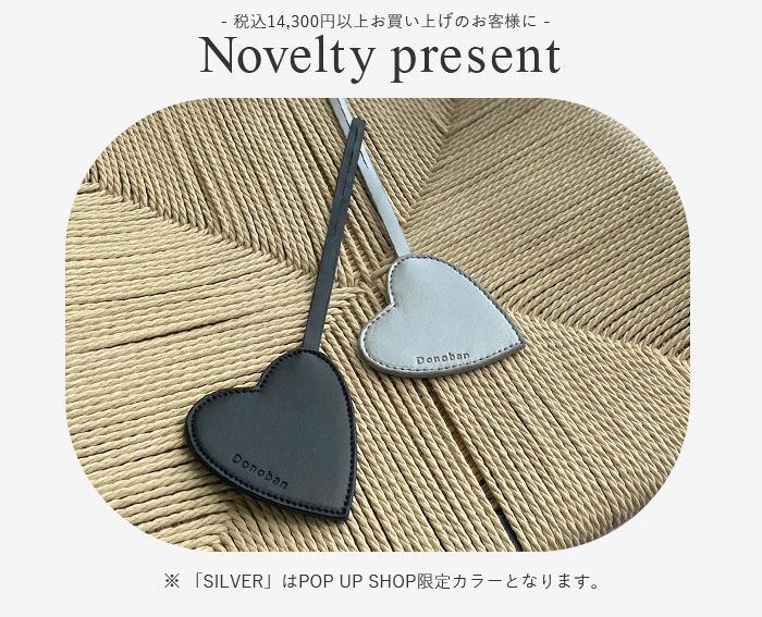 POPUP SHOPにて14,300円(税込)以上ご購入の方に 選べるノベルティプレゼント! 『ハートチャーム』POPUP SHOP限定カラーの「SILVER」もしくは 「BLACK」をプレゼント ※SILVERはPOPUP SHOP限定となります。 ※十分な数をご用意しておりますが品切れの際はご容赦くださいませ。