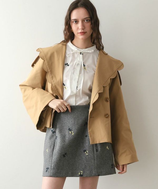 トレンチが全く似合わないので今まで着たことがなかったのですが、このトレンチは丈感も抜群でどなたでも似合うデザインかと思います。 トレンチはクールな印象がありましたが、スカラップやショート丈で可愛く着用できます。